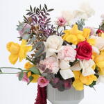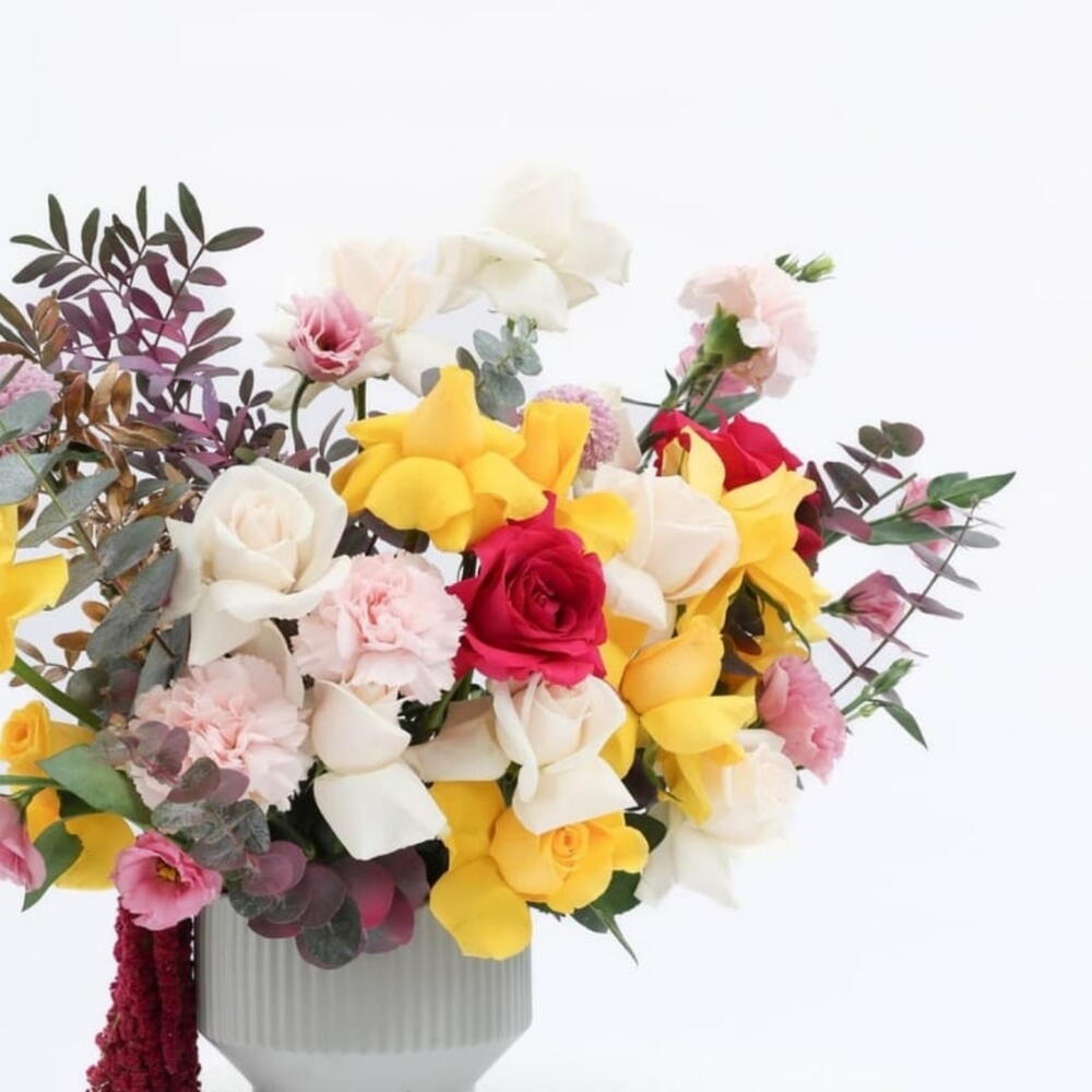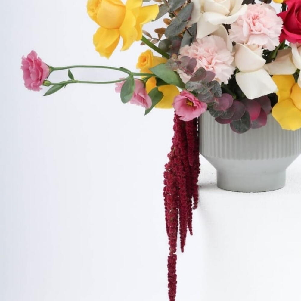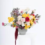 Vase - 1 pcs rose white - 5 pcs carnation pink - 3 pcs rose yellow - 10 pcs amaranthus - 1 pcs lisianthus pink - 5 pcs eucaluptus - 5 pcs pistacia leaves - 2 pcs