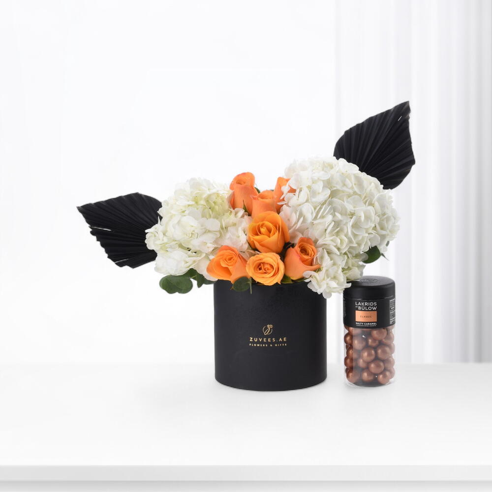This luxurious arrangement features 2 white hydrangeas symbolizing grace and purity, paired with 7 radiant orange roses representing warmth, admiration, and positivity. 3 eucalyptus stems add texture and freshness, while 2 black dried palm leaves create striking contrast — a signature ZUVEES modern touch. Complementing the florals is Lakrids by Bülow – Salt Caramel (Regular), a decadent treat of sweet liquorice coated in smooth caramel and sprinkled with sea salt for a perfectly balanced indulgence.