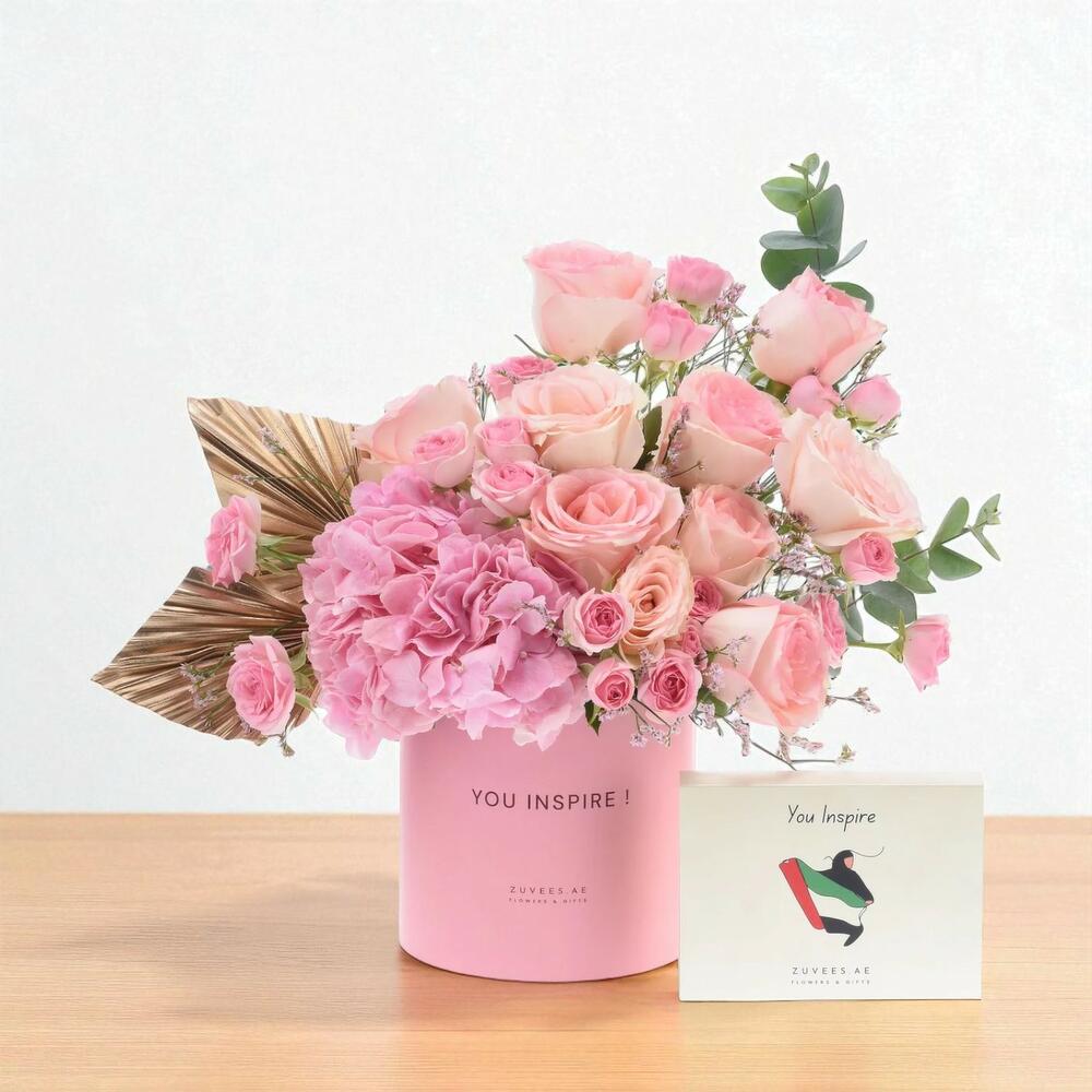 Soft, elegant, and delightfully indulgent, the Golden Pink Bloom Box with Zuvees Luxe Chocolate Combo is a thoughtful gift that leaves a lasting impression. Featuring a refined floral arrangement of blush Esperance roses, pink Hydrangea, and golden dry leaves, this bloom box carries a sense of grace and quiet confidence. Paired with the exclusive Zuvees Luxe Chocolate Box, featuring 6 handcrafted chocolate bites, it’s a perfect balance of beauty and flavor.
