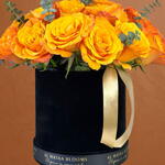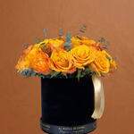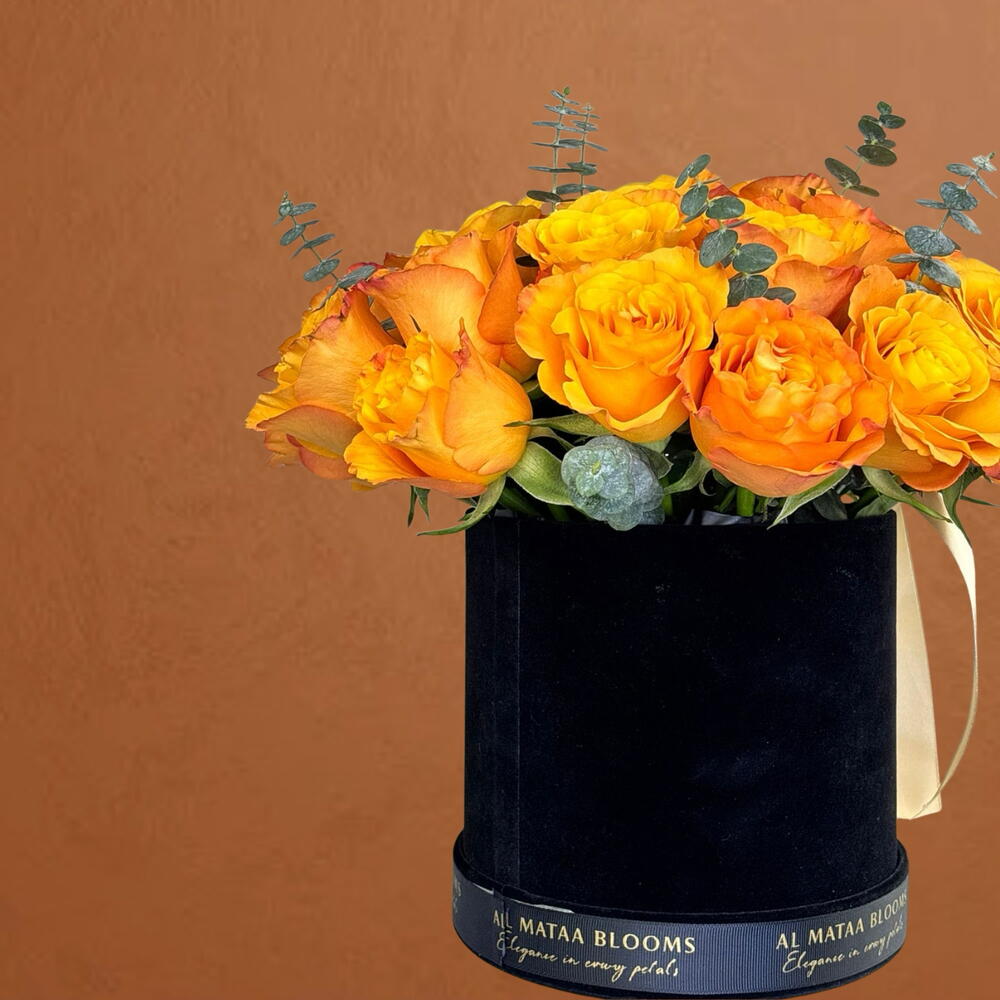 peach satin ribbon - 1 pcs eucalyptus leaves - 7 pcs confidential orange rose - 30 pcs flower food pack - 1 pcs velvet black box 15cm d x 14.5cm h - 1 pcs