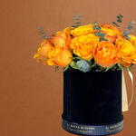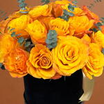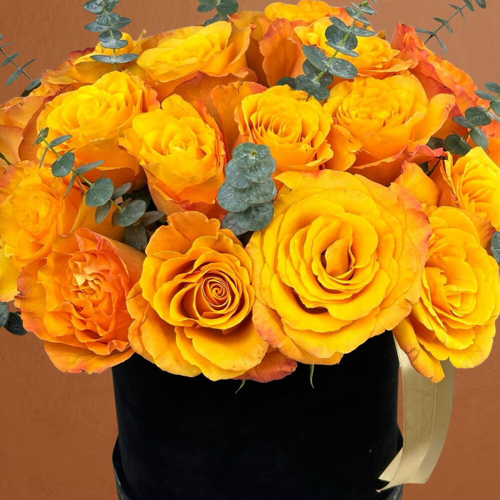 Capture the warmth of a Mediterranean sunset with our Golden Sunset Collection. This exquisite arrangement features 30 hand-selected premium roses in a rich, multi-tonal orange with golden undertones. The blooms are punctuated by silver-green eucalyptus sprigs, adding a fresh, modern texture.