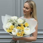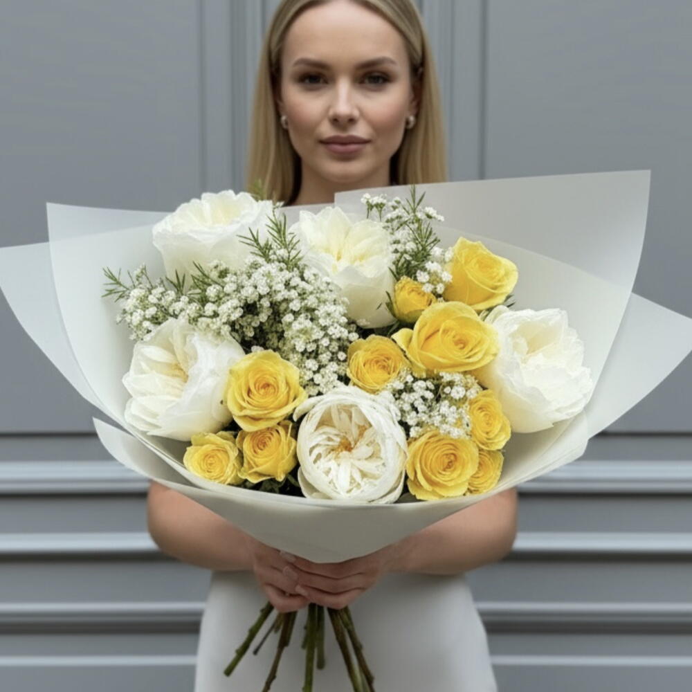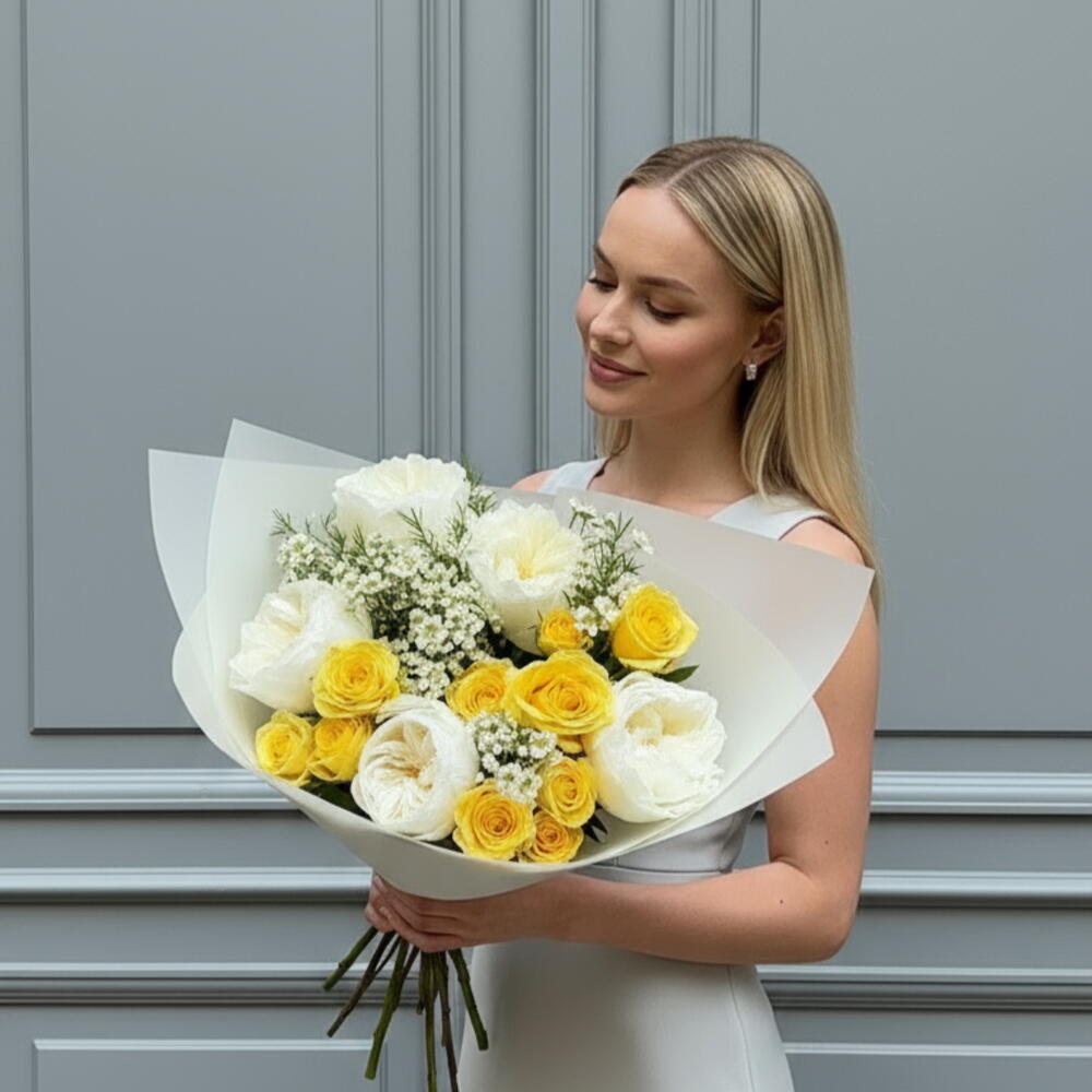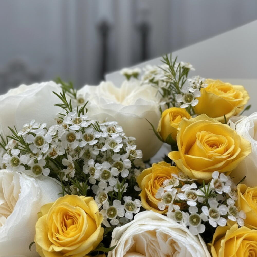wax - 3 pcs white garden rose - 5 pcs spray yellow - 3 pcs
