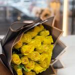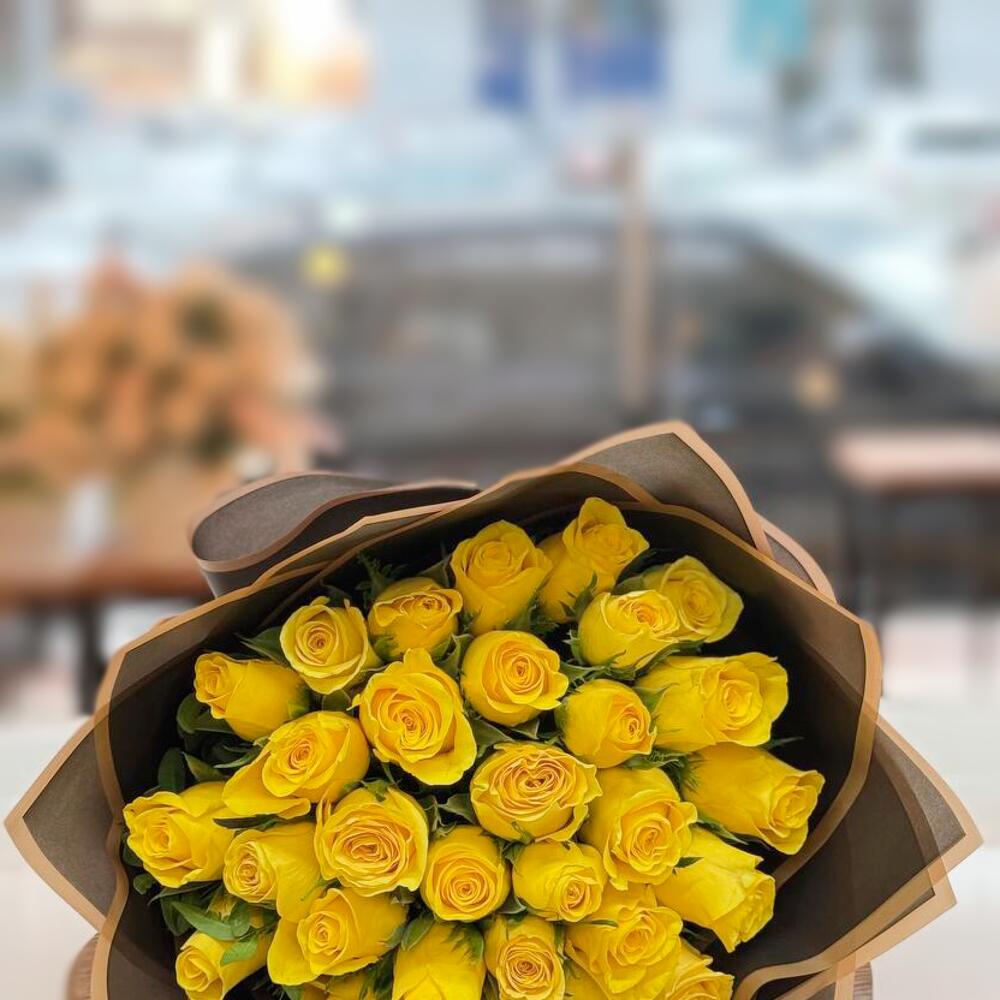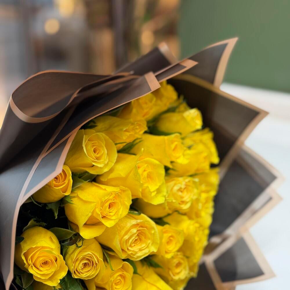 This stunning bouquet of vibrant yellow roses is a true symbol of joy, optimism, and warmth. The bright blooms radiate positivity and are perfect for expressing gratitude, friendship, or simply to brighten someone’s day. Wrapped in an elegant black paper with golden accents, the contrast highlights the rich, sunny shades of the roses, making the arrangement even more striking. Each rose is carefully selected for its freshness and beauty, ensuring your gift leaves a lasting impression. To keep the bouquet fresh longer, trim the stems diagonally, place the flowers in clean, cool water, and change the water every 1–2 days. Avoid placing the bouquet near direct sunlight or heat sources. With the right care, this radiant bouquet will delight the recipient for many days.