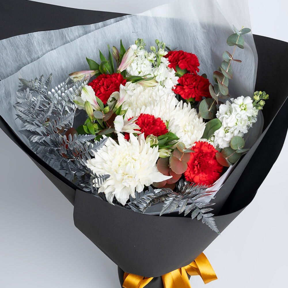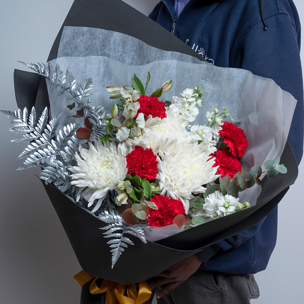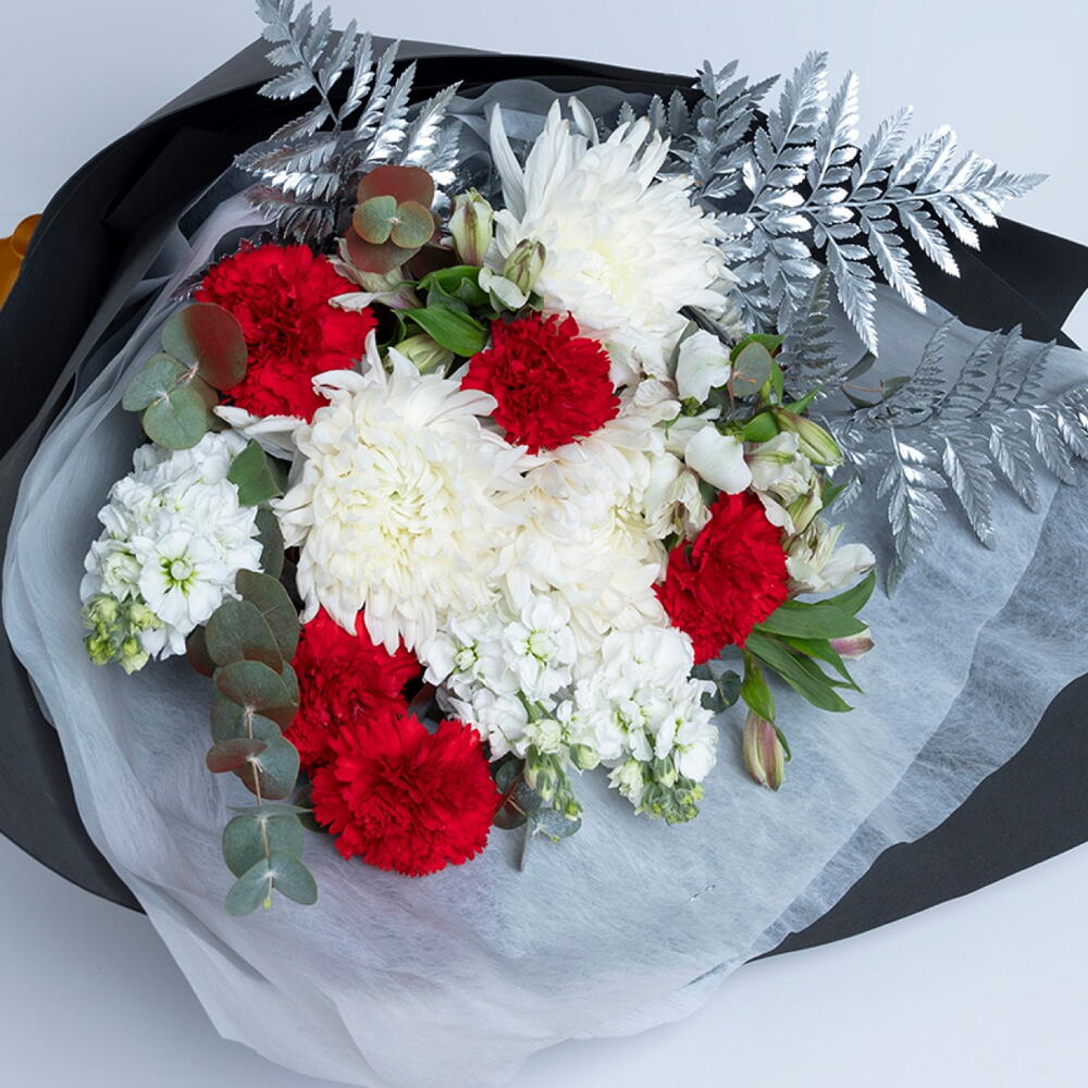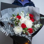 Chrysanthemum - 3 pcs Alstroemeria - 3 pcs Decoration - 4 pcs carnation - 5 pcs matthiola - 3 pcs ribbon satin - 1 pcs leather ferns - 3 pcs