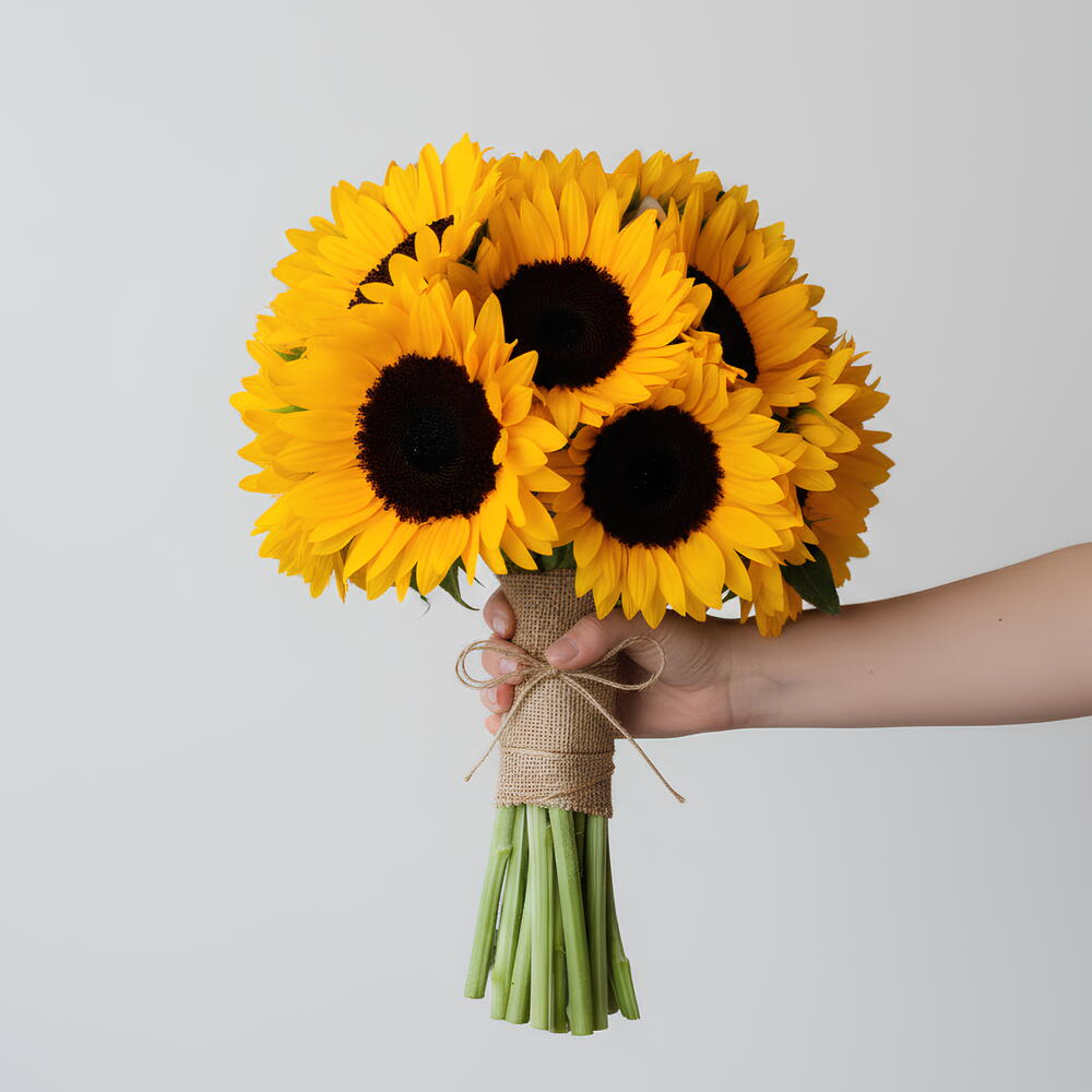 A radiant hand-tied bouquet of 15 vibrant sunflowers, wrapped in rustic jute for a natural yet elegant bridal touch. Golden Vow captures the warmth of love, joy, and commitment—perfect for a bride who shines with confidence and charm.