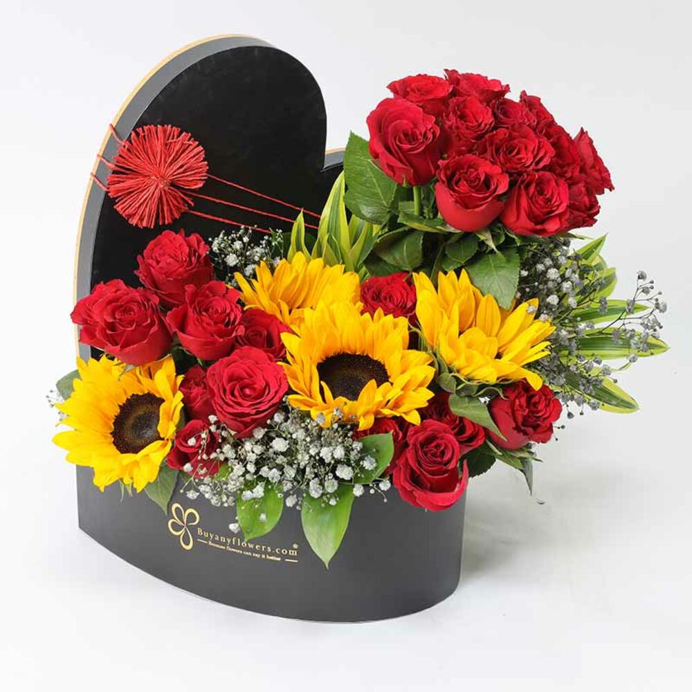 Product details: 4 Stems Sunflower, 25 Red Rose, Leaves and Fillers - 2 Song of India, 2 Gypso and 5 Single Ruscus, Prepared in a Black Heart Shape Box.