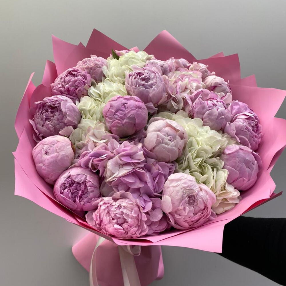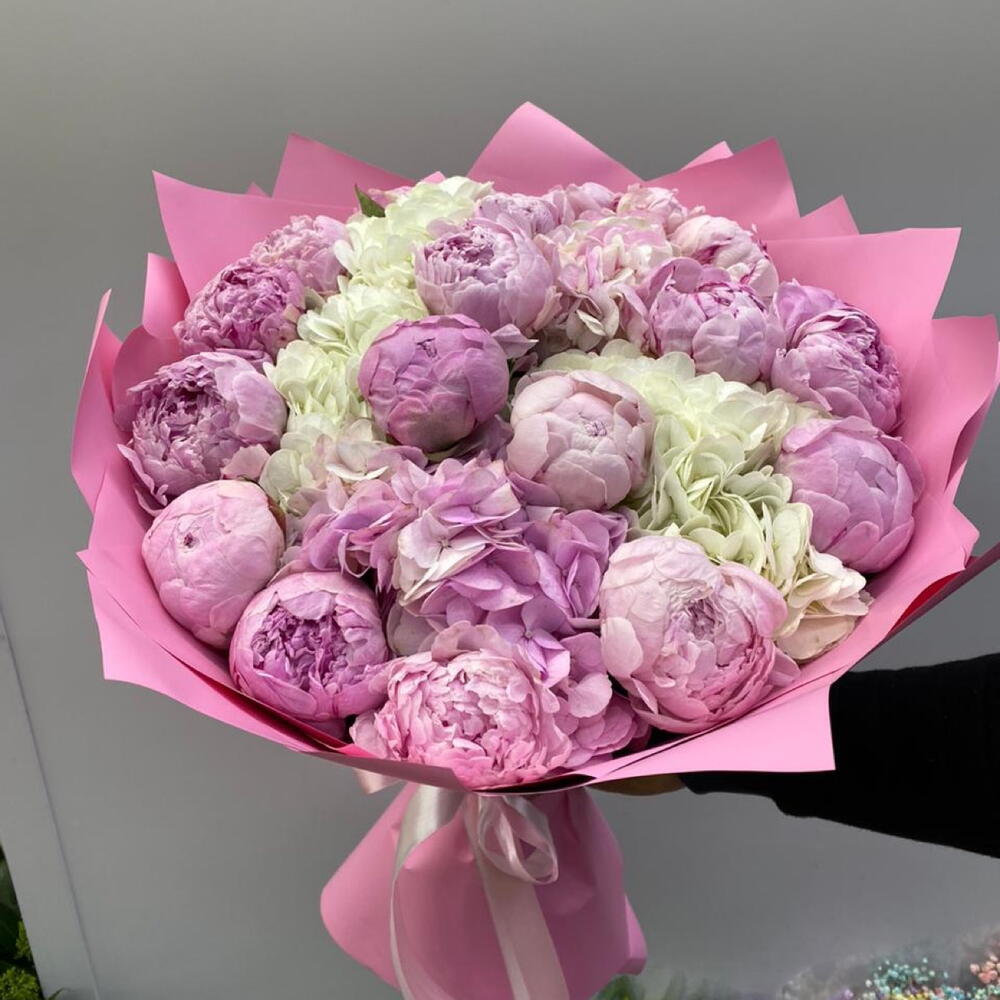 Bouquet of pink peonies and white hydrangeas