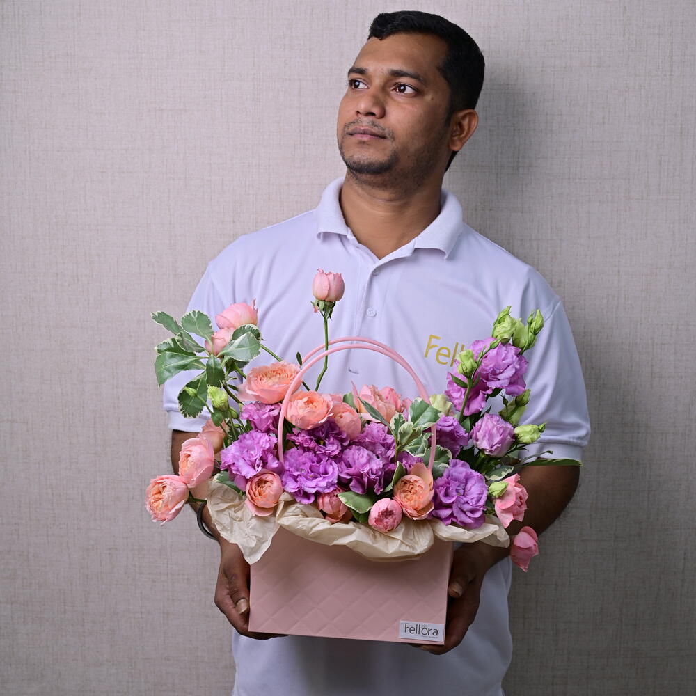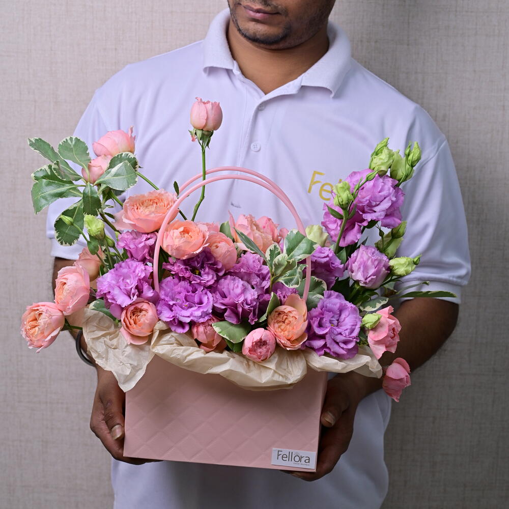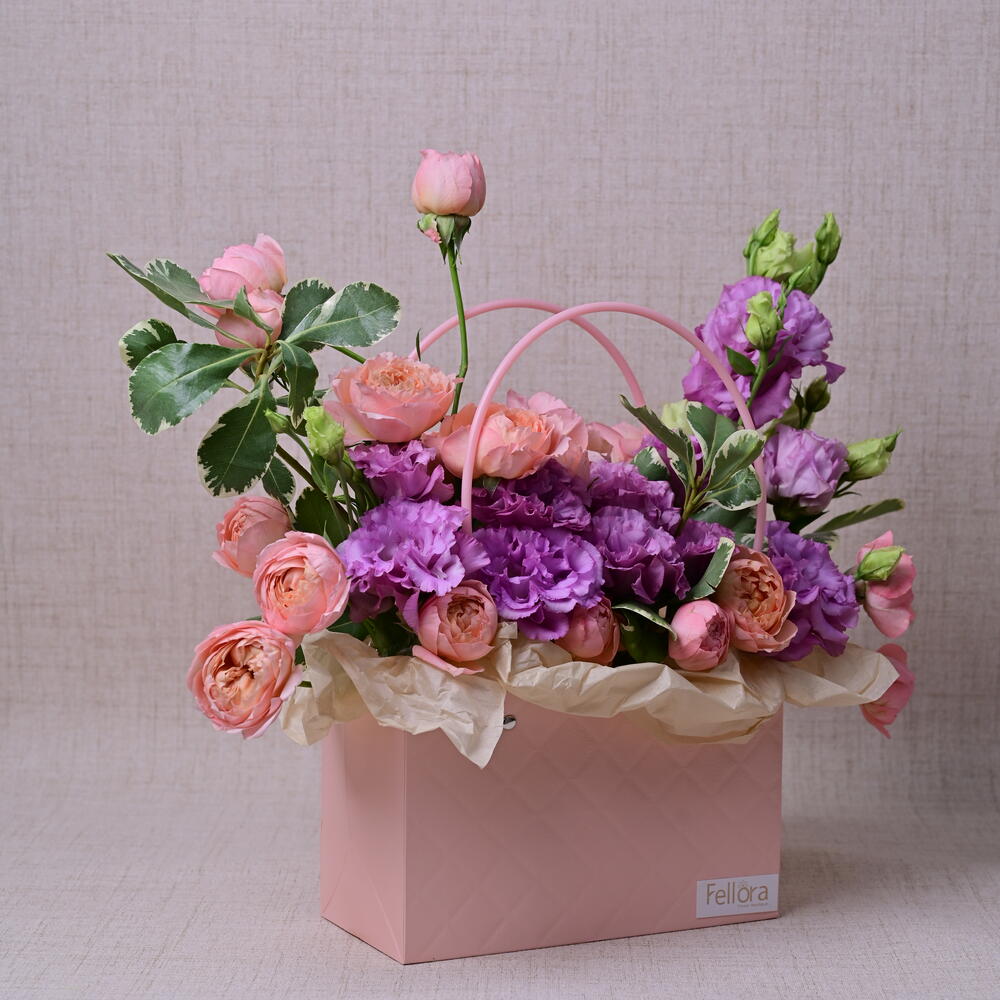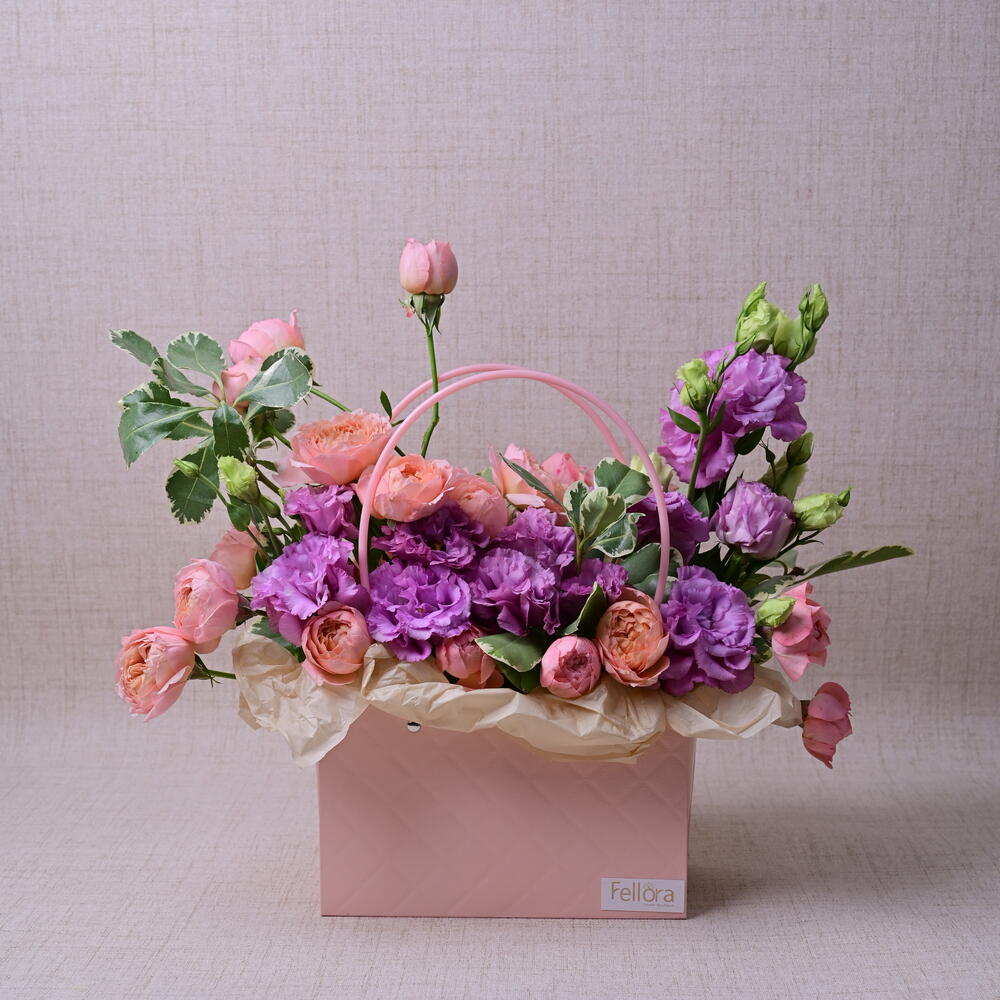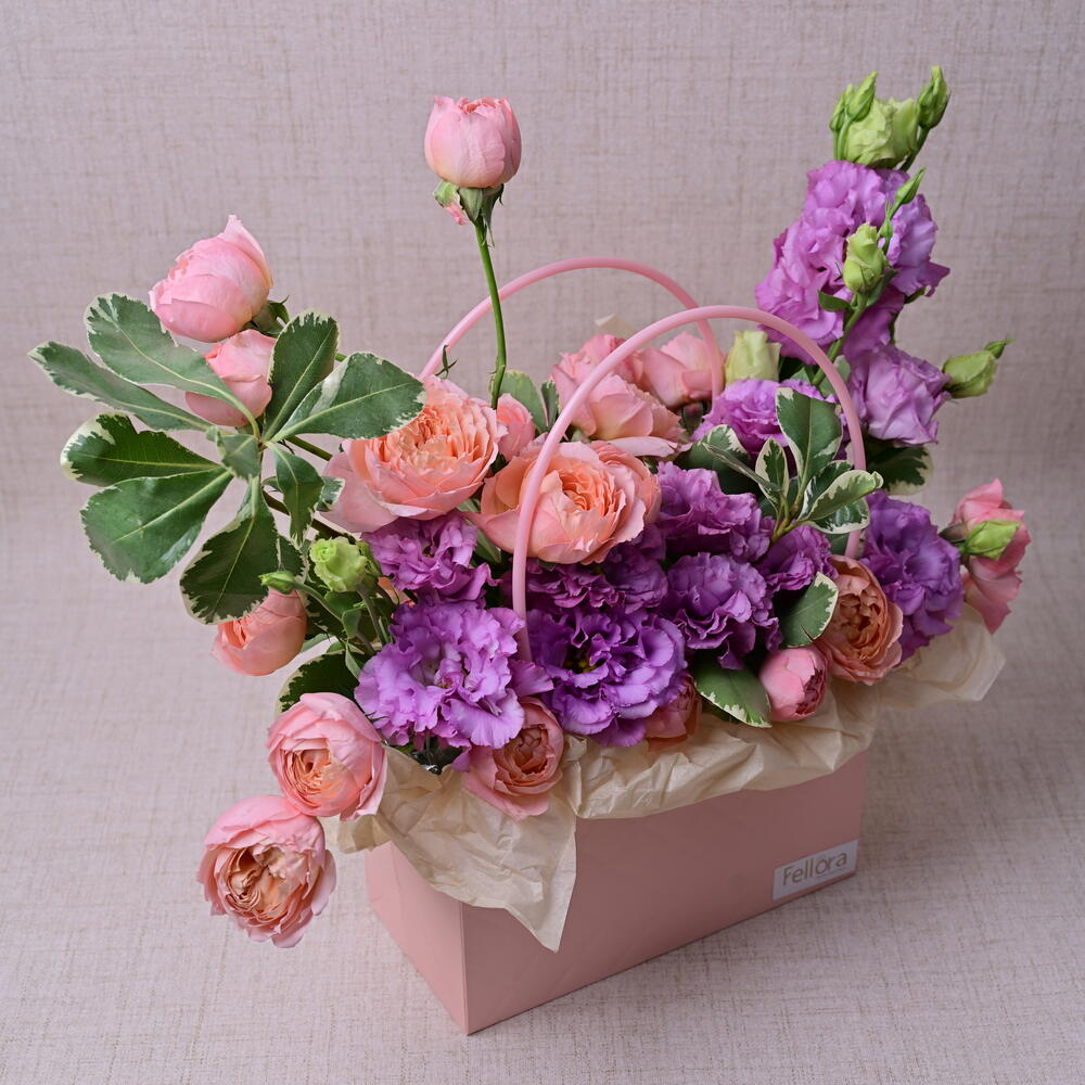 juliet - 5 pcs purple lisianthus - 5 pcs paper box - 1 pcs pittosporum green leaves - 3 pcs