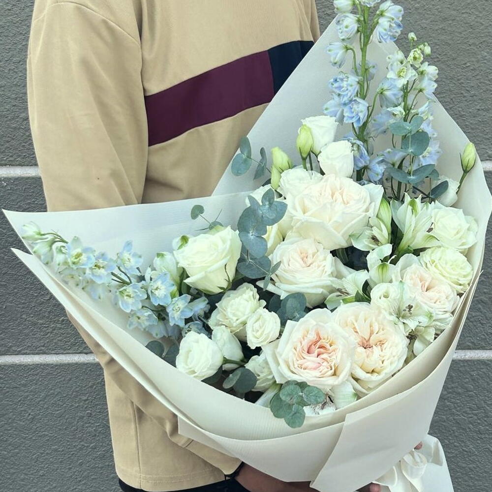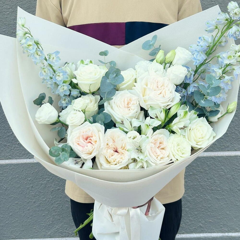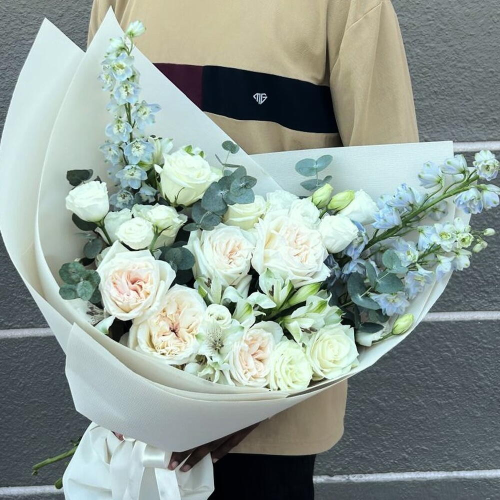 alstroemeria white - 2 pcs wrapping paper - 3 pcs white ohara - 5 pcs eucalyptus leaves - 3 pcs lisanthus white - 3 pcs delphinium lblue - 3 pcs