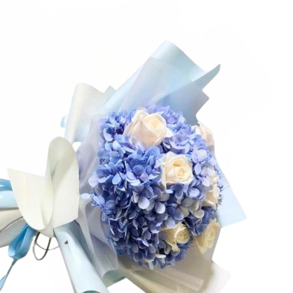 Appearance: Hydrangeas are known for their large, spherical flowerheads composed of numerous small florets, creating a lush, full appearance. The ones in the image are a distinct shade of blue. Arrangement: The bouquet showcases a prominent cluster of blue hydrangeas, complemented by green foliage and smaller white or light-colored filler flowers. Wrapping: The flowers are elegantly wrapped in multiple layers of light blue and white paper, tied with a matching blue ribbon, enhancing the bouquets presentation. Symbolism: Hydrangeas can symbolize various sentiments including gratitude, grace, beauty, heartfelt emotion, appreciation, and sometimes apology.