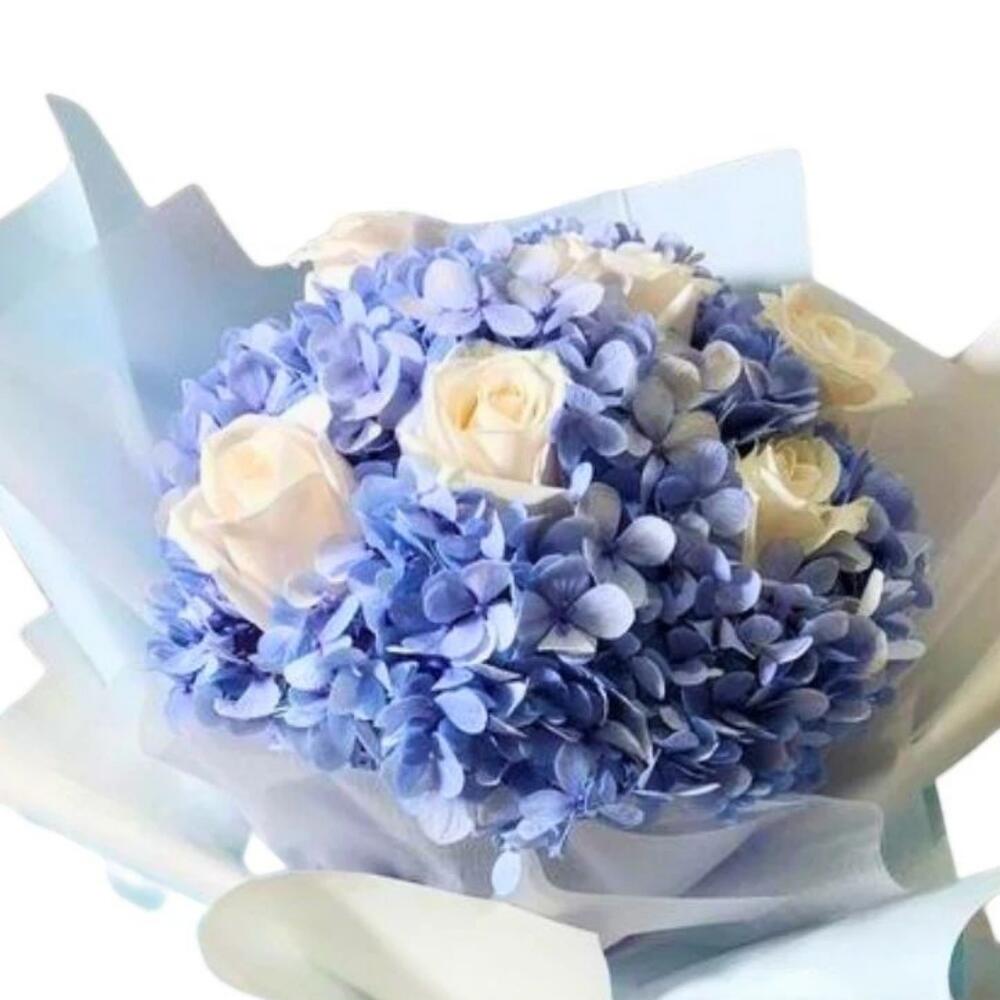 hydrangea blue - 3 pcs cream white roses - 6 pcs