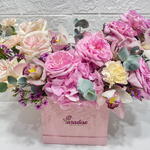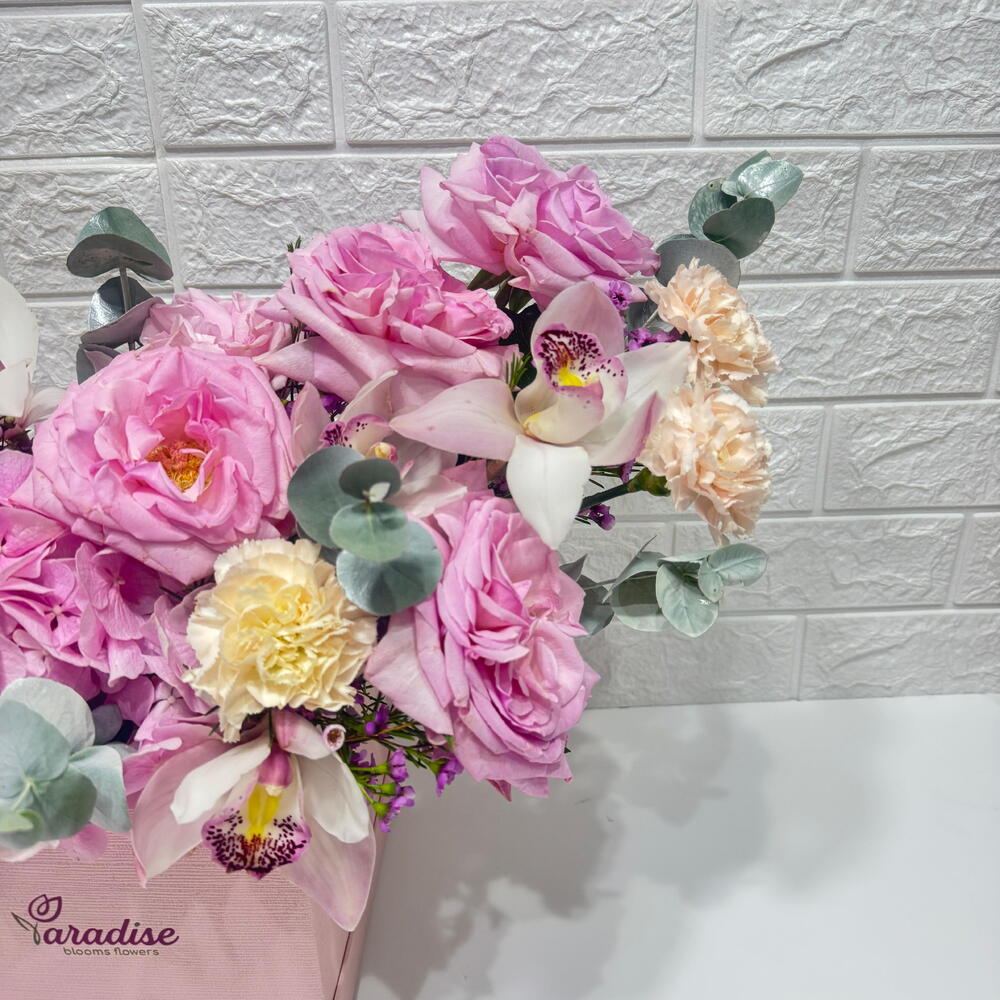 The Graceful Harmony bouquet is an exquisite display of elegance and balance. Housed in a luxurious pink box, this arrangement beautifully contrasts soft white Ohara roses on one side with rich pink Ohara roses on the other, symbolizing the union of purity and passion. Delicate peach carnations weave through the blooms, adding warmth and charm to the arrangement, while hydrangea forms a lush and voluminous base, providing texture and depth. Perfect for special celebrations, this premium bouquet radiates sophistication and timeless beauty, making it an ideal choice for expressing deep sentiments and admiration.