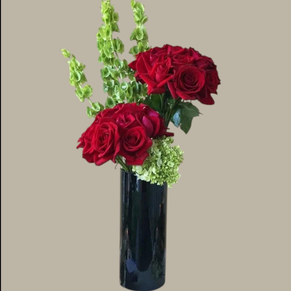 A striking arrangement that blends bold red roses with the refreshing elegance of green hydrangeas and the graceful height of Bells of Ireland. Set in a sleek black vase, this bouquet exudes modern romance and timeless sophistication — perfect for anniversaries, formal events, or a stylish gift to impress. ❤️💚