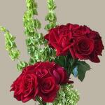 glass vase - 1 pcs green hydrangea - 2 pcs bells of ireland - 5 pcs red roses - 20 pcs