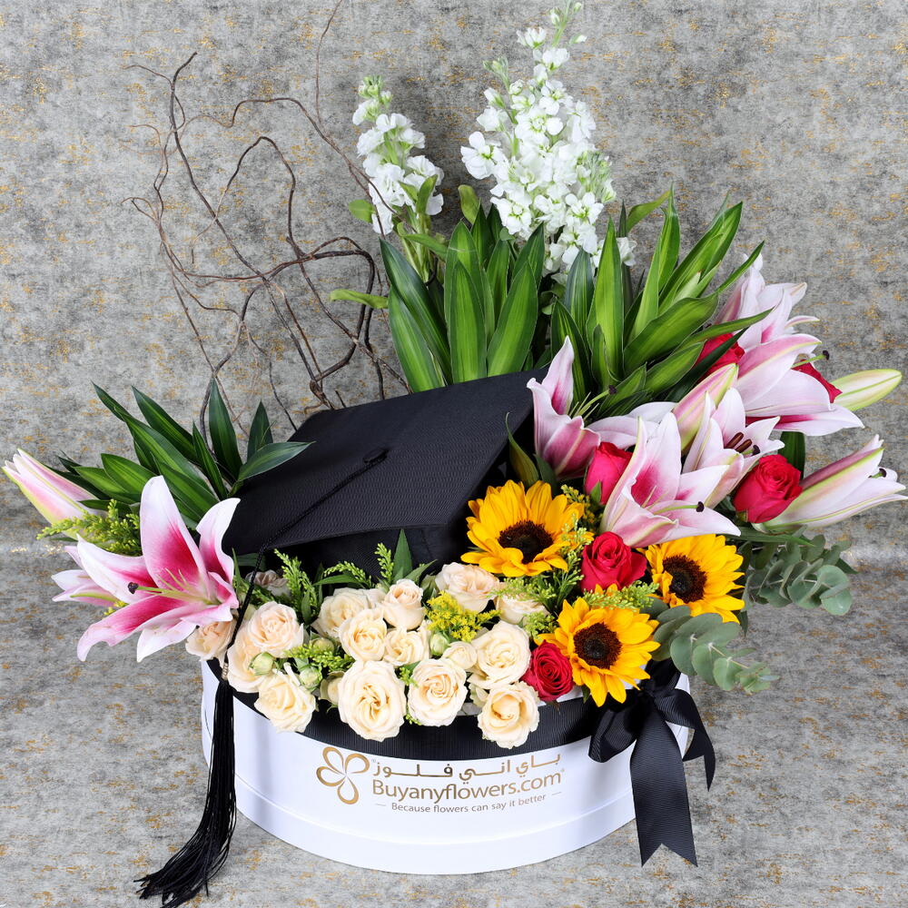 Premium Fabric Graduation Hat, 4 Stems Pink Oriental Lilies, 3 Sunflowers, 6 White Matthiola, 6 Dark Pink Roses, 6 Stems Peach Spray Roses, 3 Solidago and 3 Salix Sticks, Leaves : 3 Song of Jamaica and 3 Eucalyptus, Prepared in XXL White Round Box.