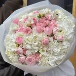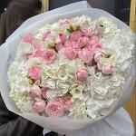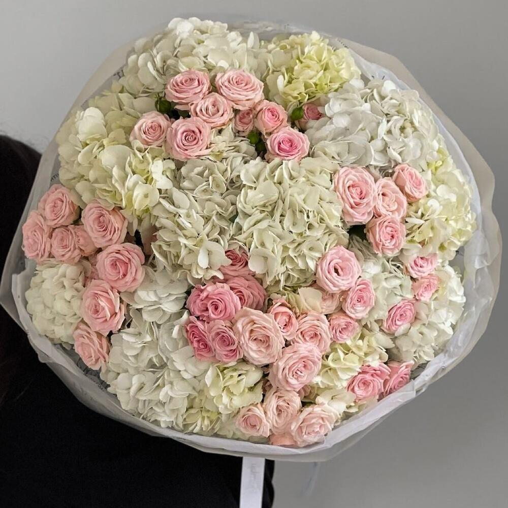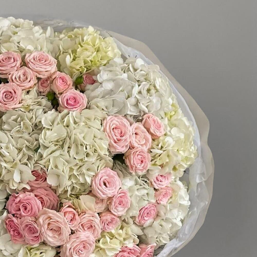 An opulent arrangement of grand pink and white hydrangeas paired with lush garden spray roses, creating a stunning display of texture and elegance. Wrapped in premium paper and tied with a satin ribbon, this luxurious bouquet is perfect for making a grand romantic gesture, celebrating milestones, or adding a show-stopping centerpiece to any occasion.