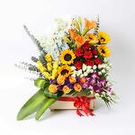 Product Details: 5 Stems Sunflowers, 3 Stems Orange Asiatic Lily, 8 Stem Yellow Rose, 6 Stem Orange Rose, 7 Stems Rec Carnation, 6 Stems Purple Orchid, 8 Stems white Baby Rose, 5 Stems Light Dephinium , 10 Stems Euclayptus, 3 Stems Massengena Leaves, 2 Stems Areca Palm, Prepared in a Wooden Box, Tied with a Ribbon Bow.