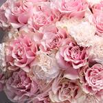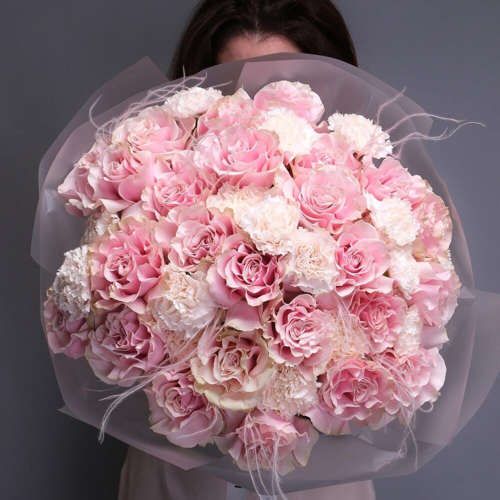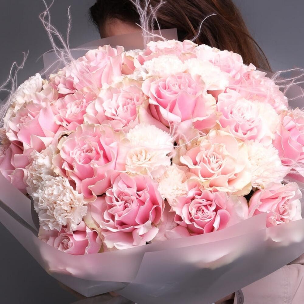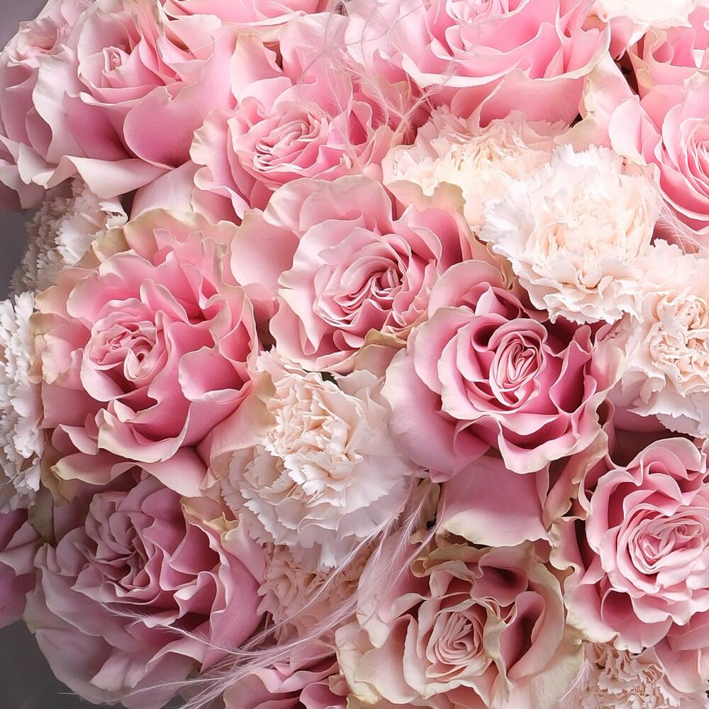soft pink carnations - 15 pcs pink classic roses - 30 pcs white stipa - 4 pcs