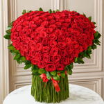 Make a bold statement of love with the Grand Red Rose Heart Bouquet. This breathtaking arrangement is made of fresh, velvety red roses, carefully shaped into a heart and surrounded by lush green leaves. With its elegant design and stunning size, this bouquet is perfect for anniversaries, proposals, or any romantic occasion.