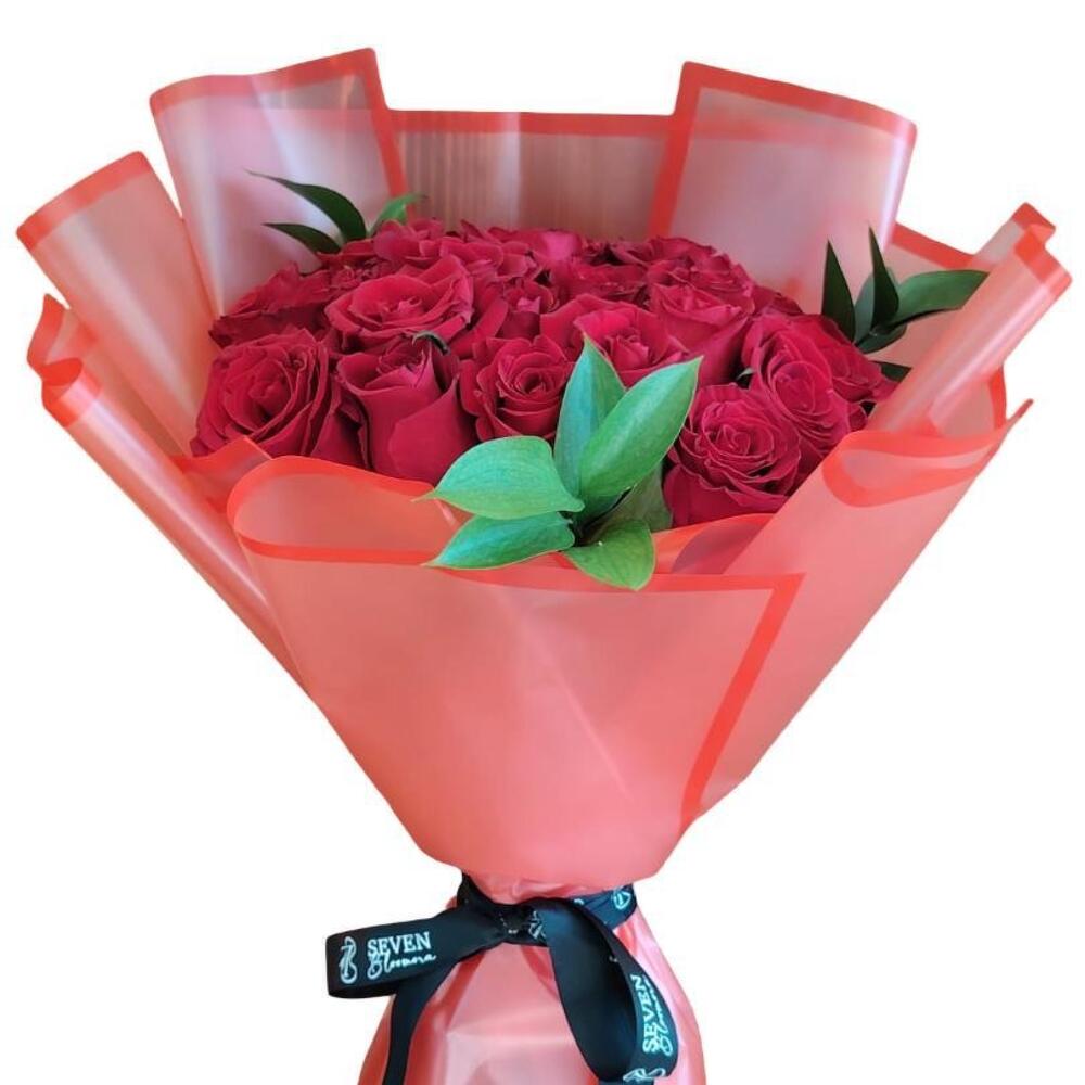 Experience the unparalleled beauty with this mono bouquet, exquisitely crafted with 20 lavish red roses, artfully complemented by 5 uniquely striking purple lumaniums. Oozing amorous allure and timeless elegance, this bouquet makes for a perfect gift to encapsulate your precious moments or to add a splash of opulence to your interiors.