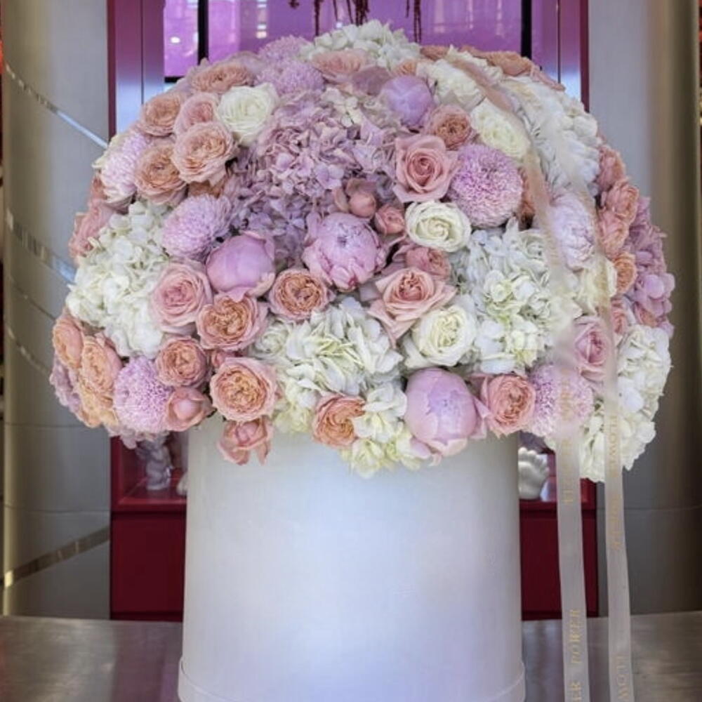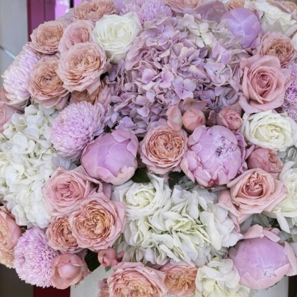 Grande Amour is a spectacular WOW-size floral box that embodies grand romance and refined luxury. The composition is built from premium peonies, delicate spray roses, lush hydrangeas, and textured chrysanthemums, creating a rich, voluminous, and perfectly balanced floral arrangement.