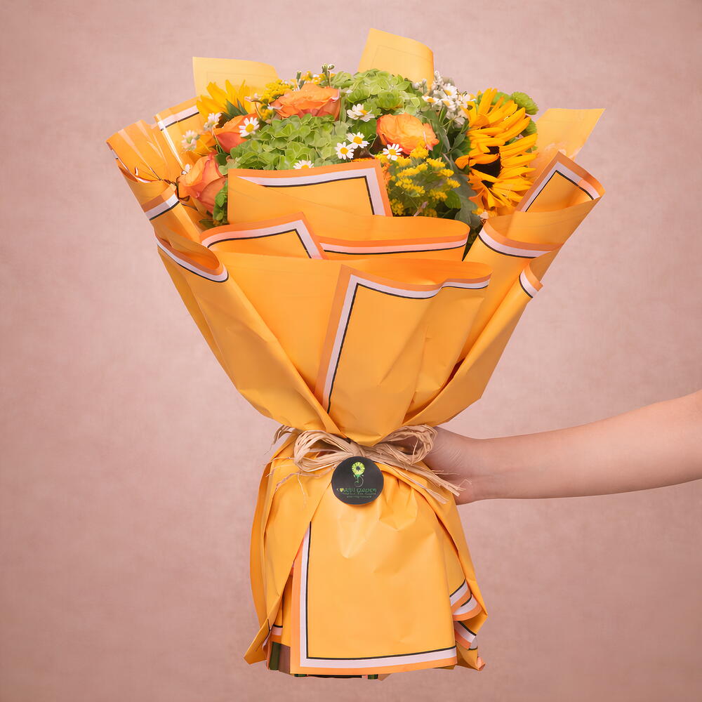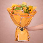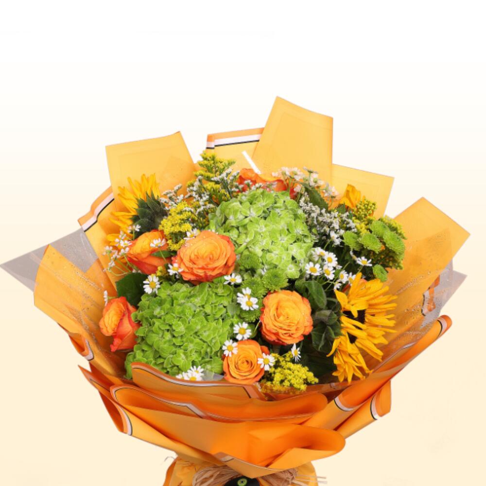 Embrace the lush beauty of nature with our Green Valley bouquet. This exquisite arrangement features a harmonious blend of vibrant hydrangeas, confident roses exuding elegance, sunflowers radiating warmth, all complemented by a delicate touch of white tanacetum. Perfect for brightening any space, this bouquet brings the charm of a verdant valley into your home or as a heartfelt gift for any occasion. Let the refreshing hues and natural grace of these blooms elevate your surroundings and spirits.