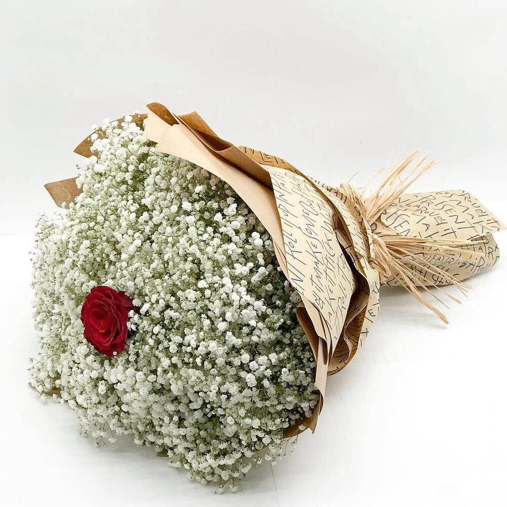 Delicate and poetic, this bouquet is a cloud of pure white gypsophila (babys breath), softly enveloping a single striking red rose at its heart. The minimalistic contrast creates a deeply emotional and symbolic composition—perfect for declarations of love, heartfelt gratitude, or a gentle surprise. Wrapped in craft paper with handwritten script, it adds a rustic charm and vintage appeal. To keep this bouquet fresh, place it in clean water, trim the stems at an angle every two days, and avoid direct sunlight and heat sources.