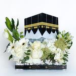 Celebrate the spiritual journey with our Hajj Mubarak flower arrangement featuring white roses, lilies, tulips, and a Kaaba centerpiece. A perfect gift for pilgrims from Shakespear Fleur.