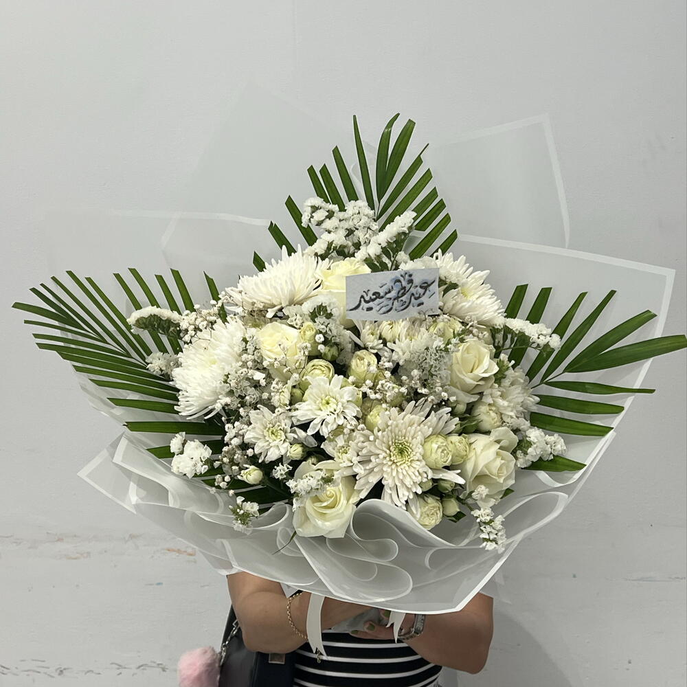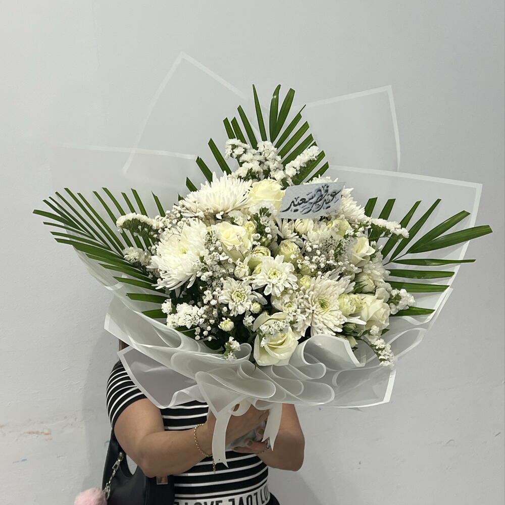 Fresh pink roses and white chrysanthemums in a stylish wrap. Perfect for any occasion