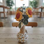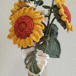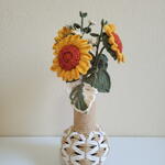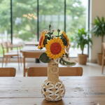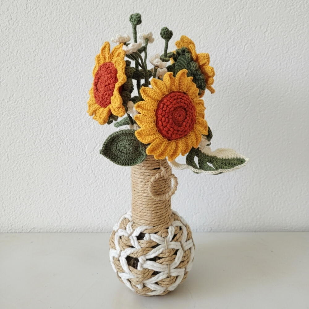 Bring a permanent ray of sunshine into any room with this exquisite, 100% handmade crochet floral arrangement. Unlike real flowers, these blooms will never fade, making them a perfect symbol of lasting love or friendship. Product Highlights Artisan Craftsmanship: Each sunflower and leaf is meticulously hand-knitted with premium, soft-touch cotton yarn, ensuring a high-quality, tactile finish. Unique Vase Design: The bouquet comes set in a stunning, rustic vase wrapped in natural jute twine, featuring a sophisticated macramé-style woven base for extra stability and texture. Everlasting Beauty: No watering or sunlight required. This eternal bouquet stays vibrant year-round, making it an eco-friendly and low-maintenance alternative to fresh cuts. Versatile Decor: The warm yellow and earthy green tones complement a variety of interior styles, from modern farmhouse to minimalist boho. Specifications Flowers: 3 Large Sunflowers + Accent White Wildflowers Foliage. Materials: Eco-friendly cotton yarn, natural jute fiber, sturdy inner core. Occasions: Perfect for birthdays, housewarmings, get well soon gifts, or as a charming desk accessory.