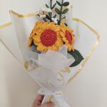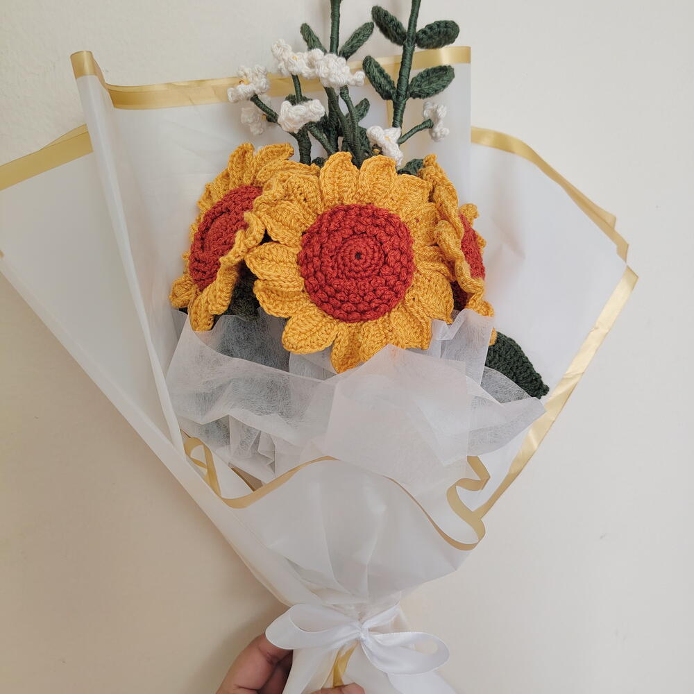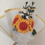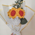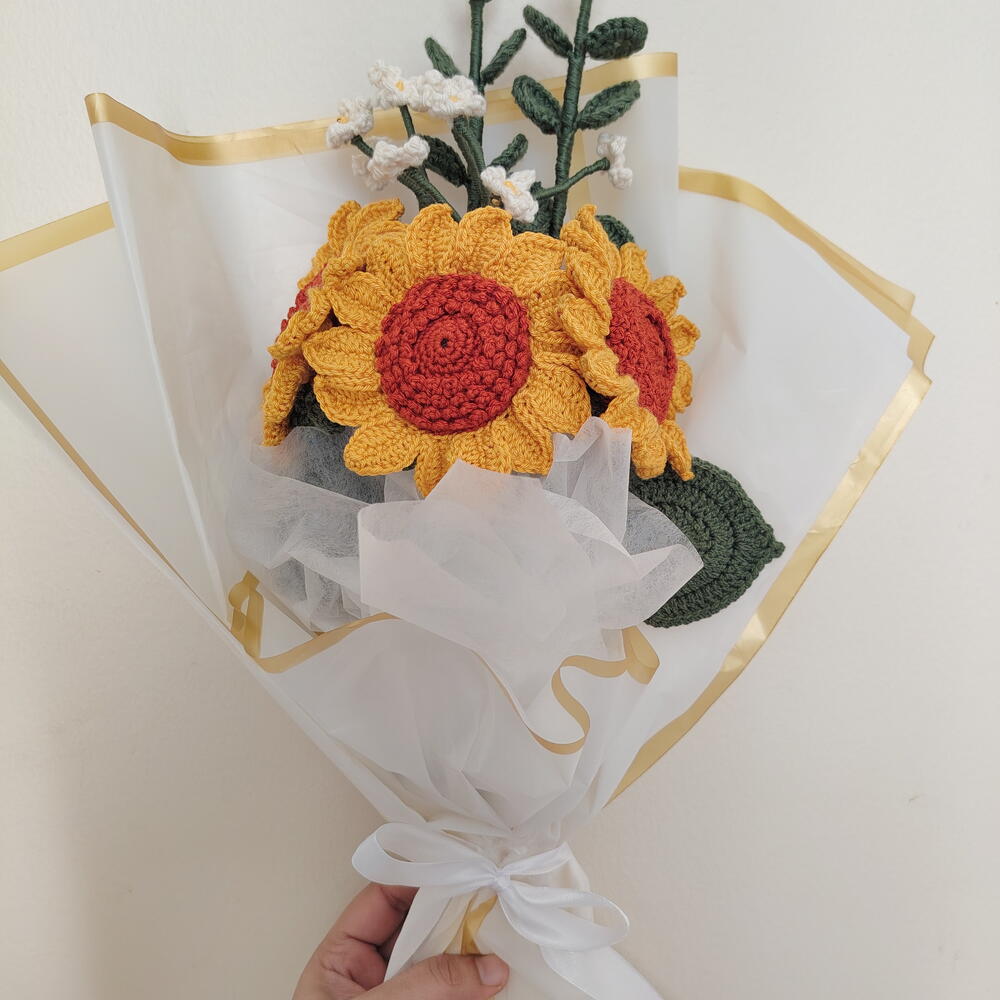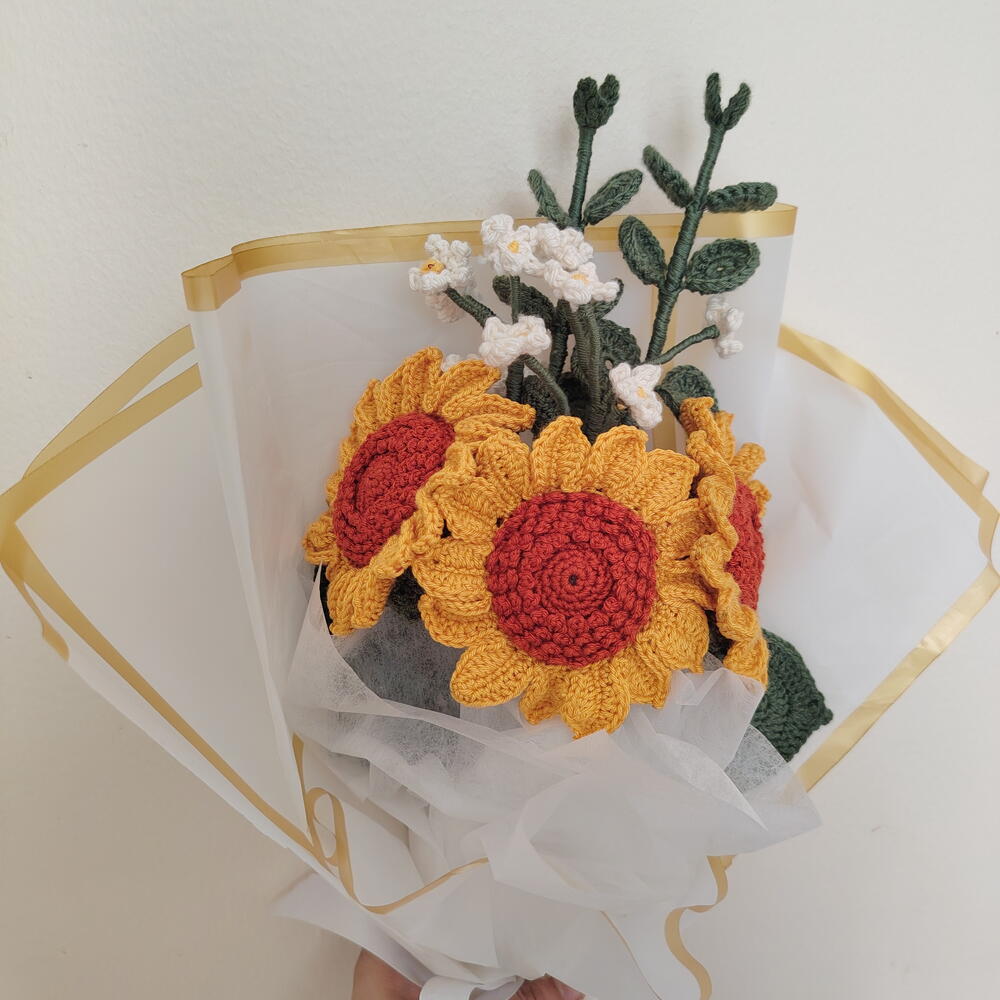 Bring home a bouquet that never fades. This charming, 100% handcrafted crochet arrangement features vibrant sunflowers, delicate white daisies, and lush greenery, all meticulously stitched from premium cotton-blend yarn. Wrapped in elegant, layered florist paper with a gold-trim finish and a satin bow, this bouquet is ready to gift for any special occasion. Why You’ll Love It: Everlasting Beauty: No watering or sunlight required. These blooms stay bright and beautiful for years. Artisanal Craftsmanship: Each petal and leaf is hand-crocheted, making every bouquet a unique work of art. Eco-Friendly Allergy-Safe: Perfect for those with pollen allergies or for hospital environments where real flowers may not be permitted. Versatile Decor: Once gifted, it serves as a stunning permanent accent for home offices, bookshelves, or bedside tables. Product Specifications: Flowers: Sunflowers (Yellow/Orange), forget me not(White), and Accent Greenery. Materials: High-quality soft yarn, sturdy inner wire stems for posing, and premium decorative wrapping