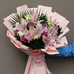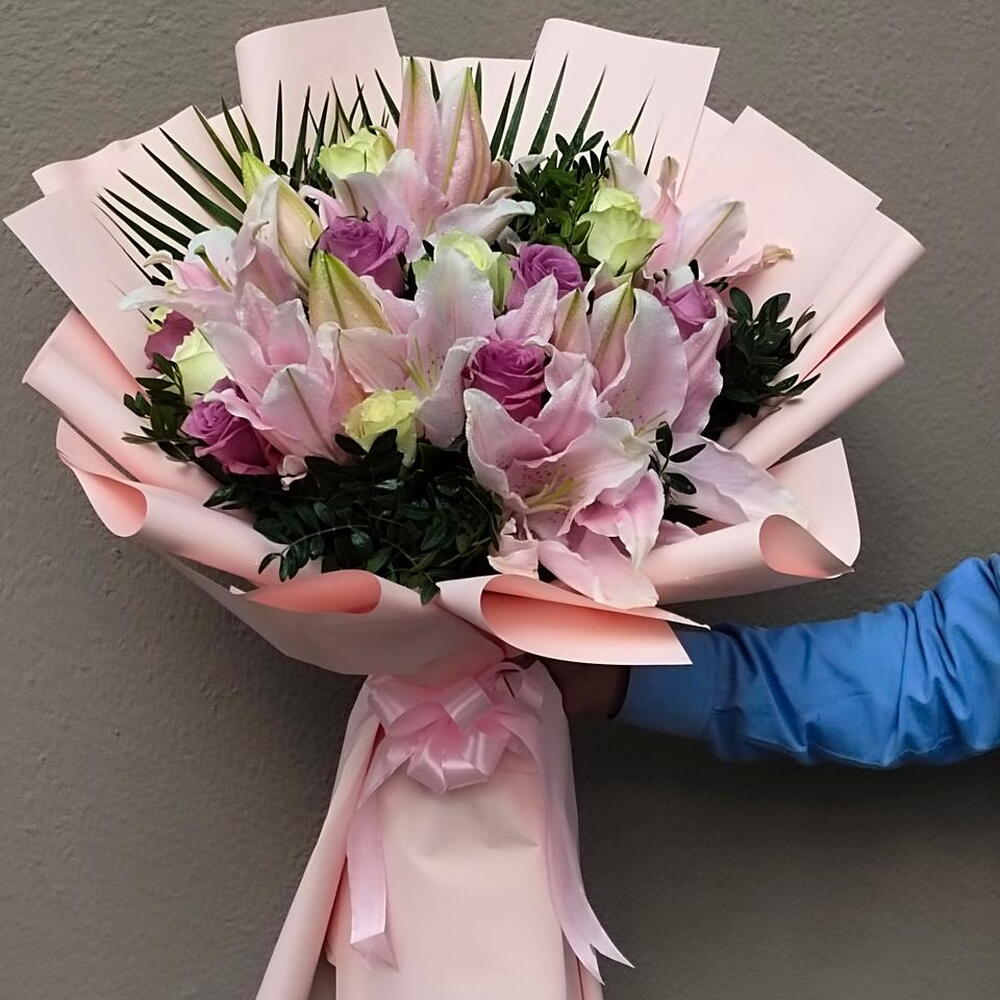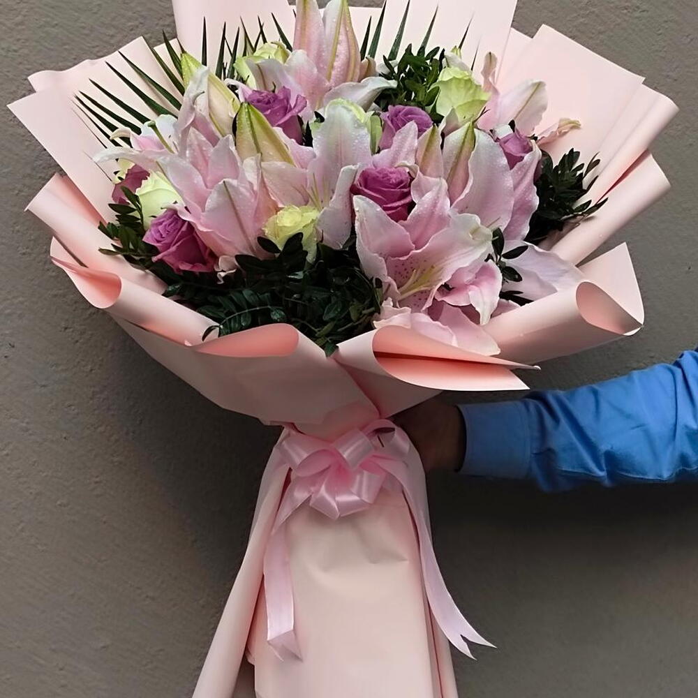 White rose - 10 pcs purple rose - 10 pcs pink lily - 4 pcs