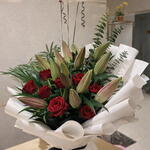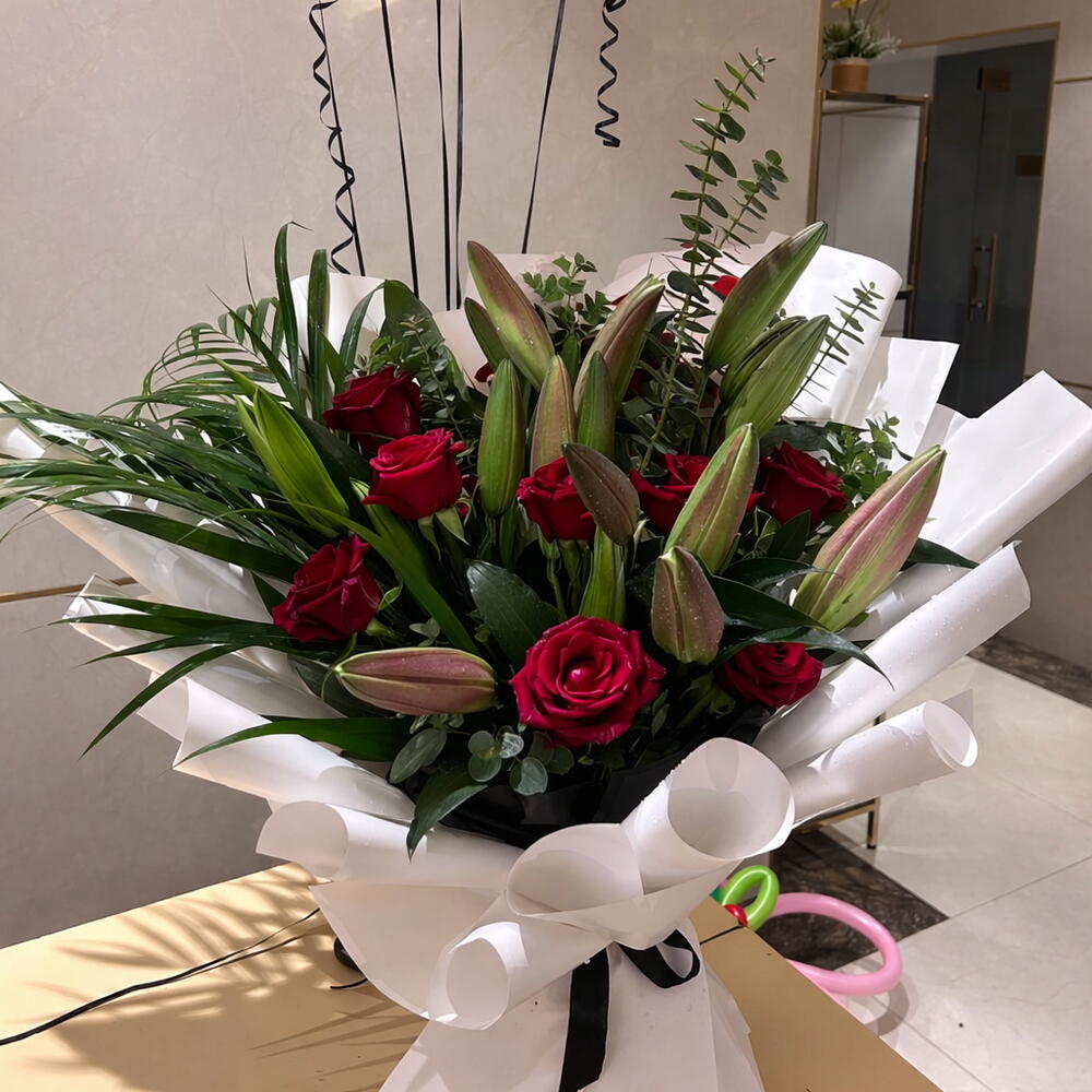 Red rose - 10 pcs Eucalyptus - 3 pcs Lily - 15 pcs areca - 1 pcs