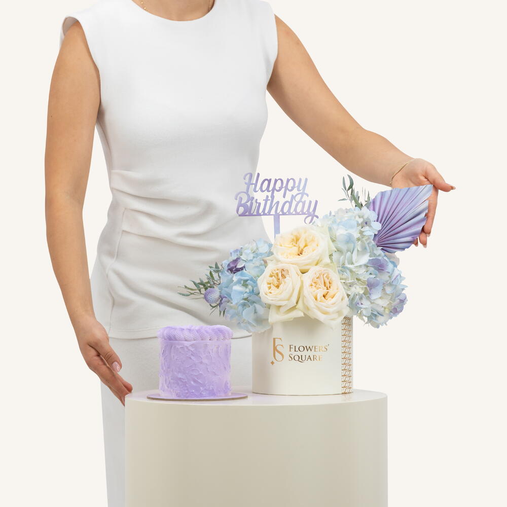 Celebrate in style with our Happy Birthday Pink Box and Cake. This elegant flower box offers a magical touch to any birthday celebration. - Hydrangeas, White OHara, Fillers and Accessories and Cake. - Happy Birthday Stick - Height: 30 Cm Width: 35 Cm - Farm Fresh Flowers