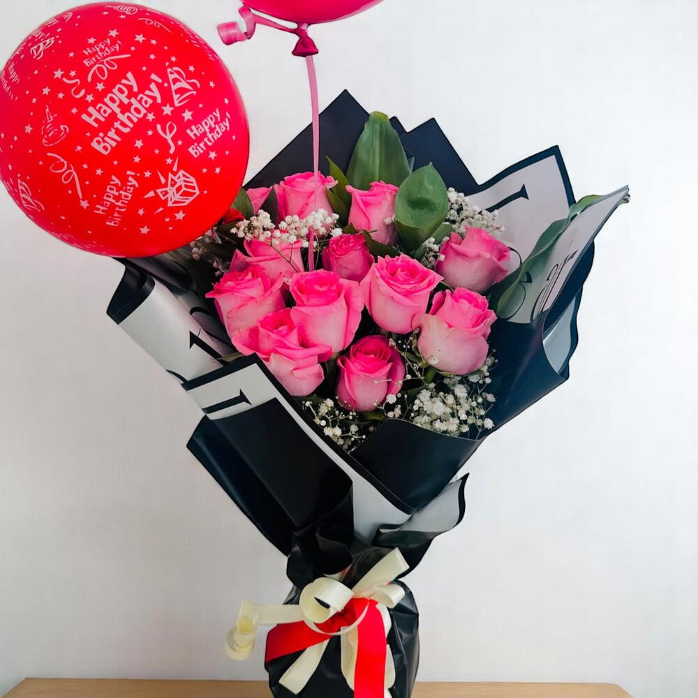 Celebrate someone special with the Happy Birthday Pink Rose Bouquet, a cheerful and charming floral arrangement designed to spread joy. Featuring fresh pink roses beautifully paired with delicate white gypsophila and wrapped in sleek black and white paper, this bouquet also comes with a festive red Happy Birthday balloon and a matching bow for a complete celebratory touch. It’s the perfect birthday gift that combines elegance with a fun, festive spirit. Care Recommendations: Keep the bouquet in a cool area away from direct sunlight and heat sources. Replace the water in the vase daily if unwrapped and cut the stems at an angle every two days for longer freshness. If kept wrapped for presentation, rehydrate as soon as possible to prolong the life of the roses. Balloons are air-filled and should remain inflated for several days indoors.