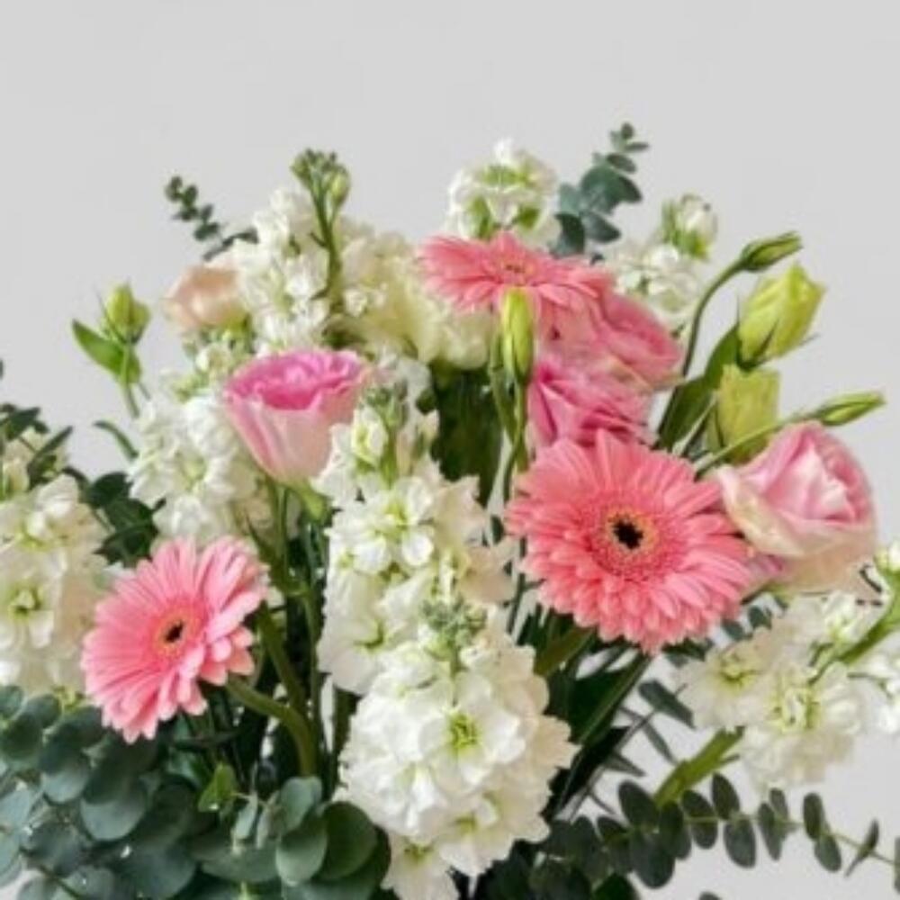 Pink gerbera daisies often symbolize grace, gentility, and admiration, and are sometimes used as get well soon flowers to express strength. White stock flowers are known for their ruffled petals, tall stems, and fragrance, and they are often used in romantic bouquets. This type of bouquet is commonly used for birthdays, congratulations, or as a thoughtful gift.