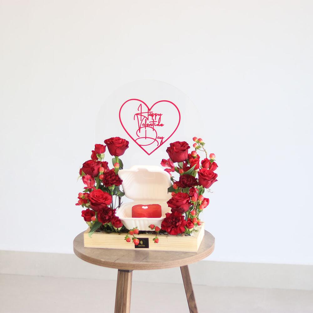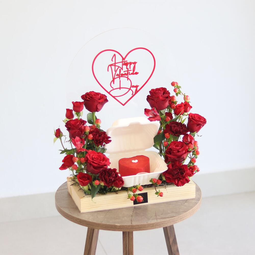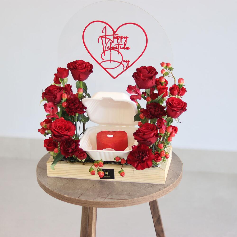combination of Red Roses, Carnation and other mix of flowers arranged with 200g heart cake in a wooden tray