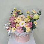 pink eustoma - 2 pcs cream spray rose - 9 pcs gift bag - 1 pcs pink circle box - 1 pcs