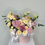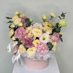 9 gentle beige spray roses are artfully combined with dainty pink eustoma in a charming round box, bringing a hint of delightful grace.