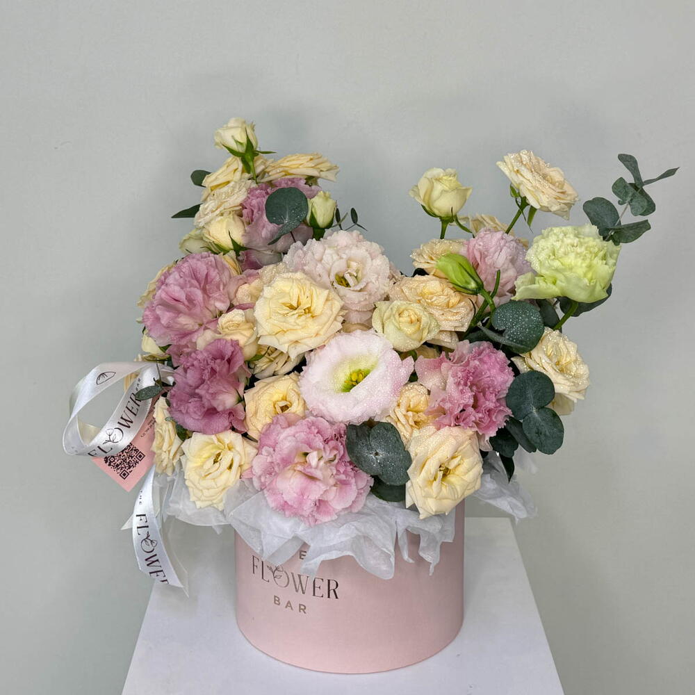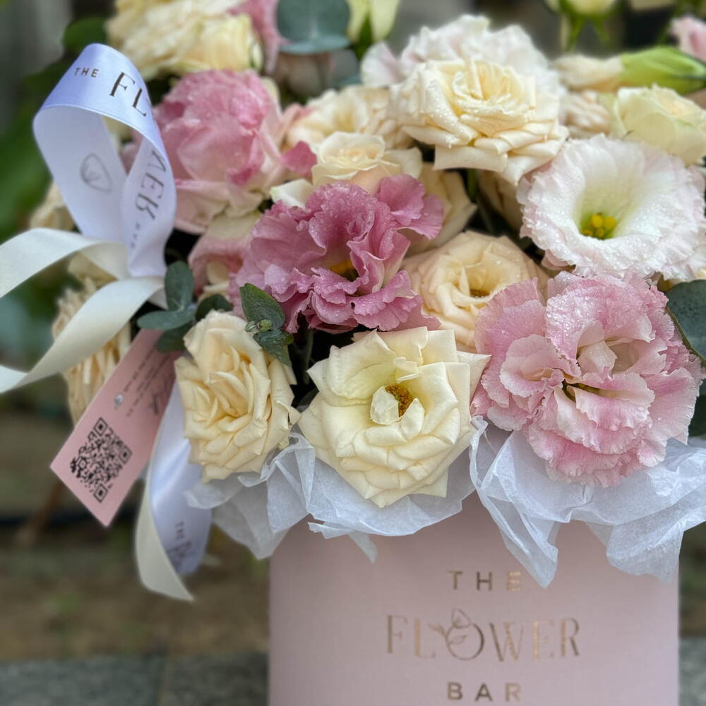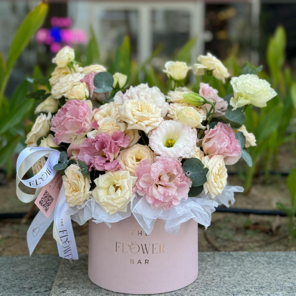 9 gentle beige spray roses are artfully combined with dainty pink eustoma in a charming round box, bringing a hint of delightful grace.
