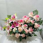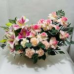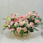 Experience the serene beauty 3 pink lilies, and 12 pink roses,8 pink carnation all elegantly arranged with fillers in a charming handle basket. This arrangement blends crisp pink, making it a perfect choice for expressing peace, elegance, or heartfelt sentiments on any special occasion.