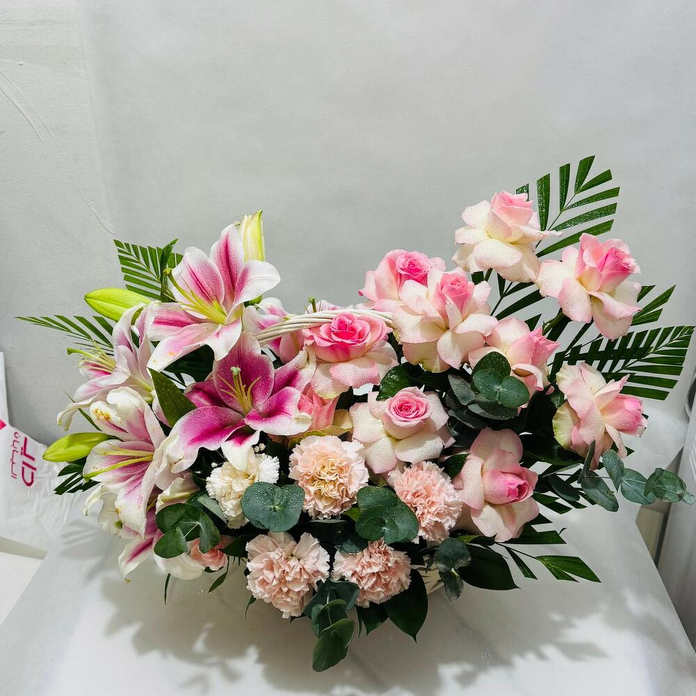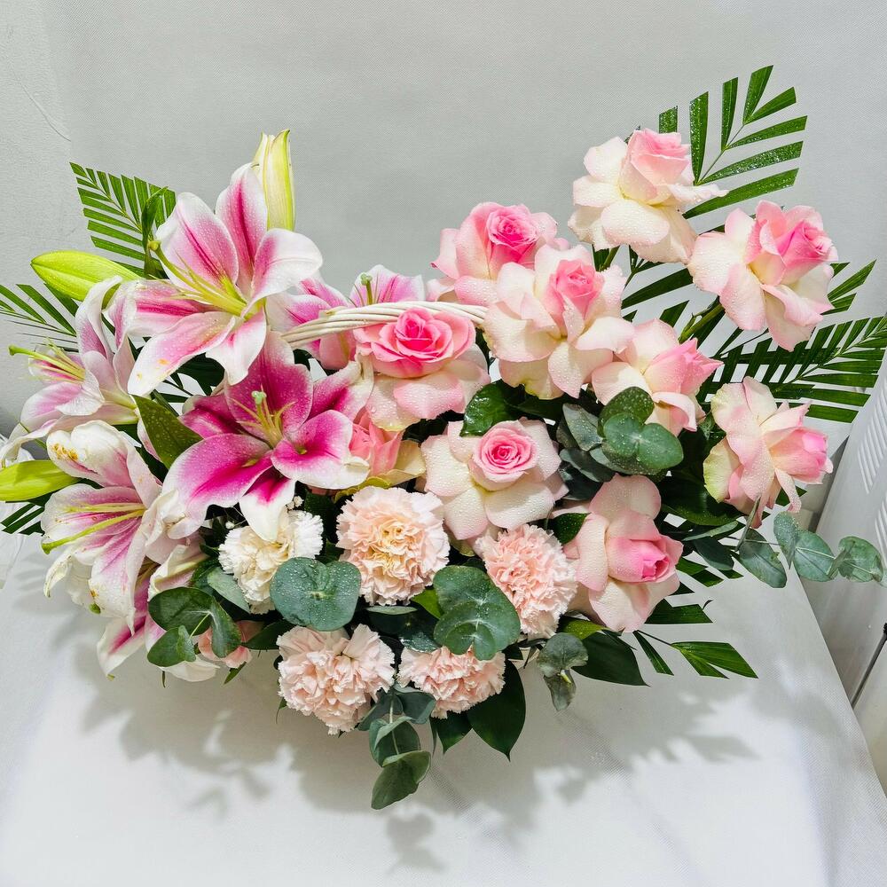 Experience the serene beauty 3 pink lilies, and 12 pink roses,8 pink carnation all elegantly arranged with fillers in a charming handle basket. This arrangement blends crisp pink, making it a perfect choice for expressing peace, elegance, or heartfelt sentiments on any special occasion.