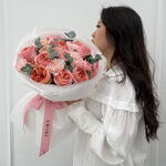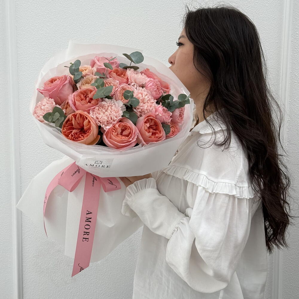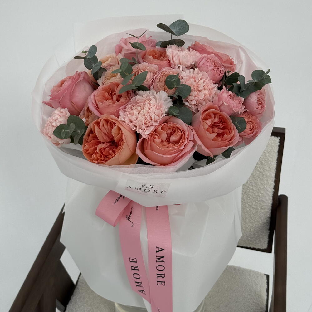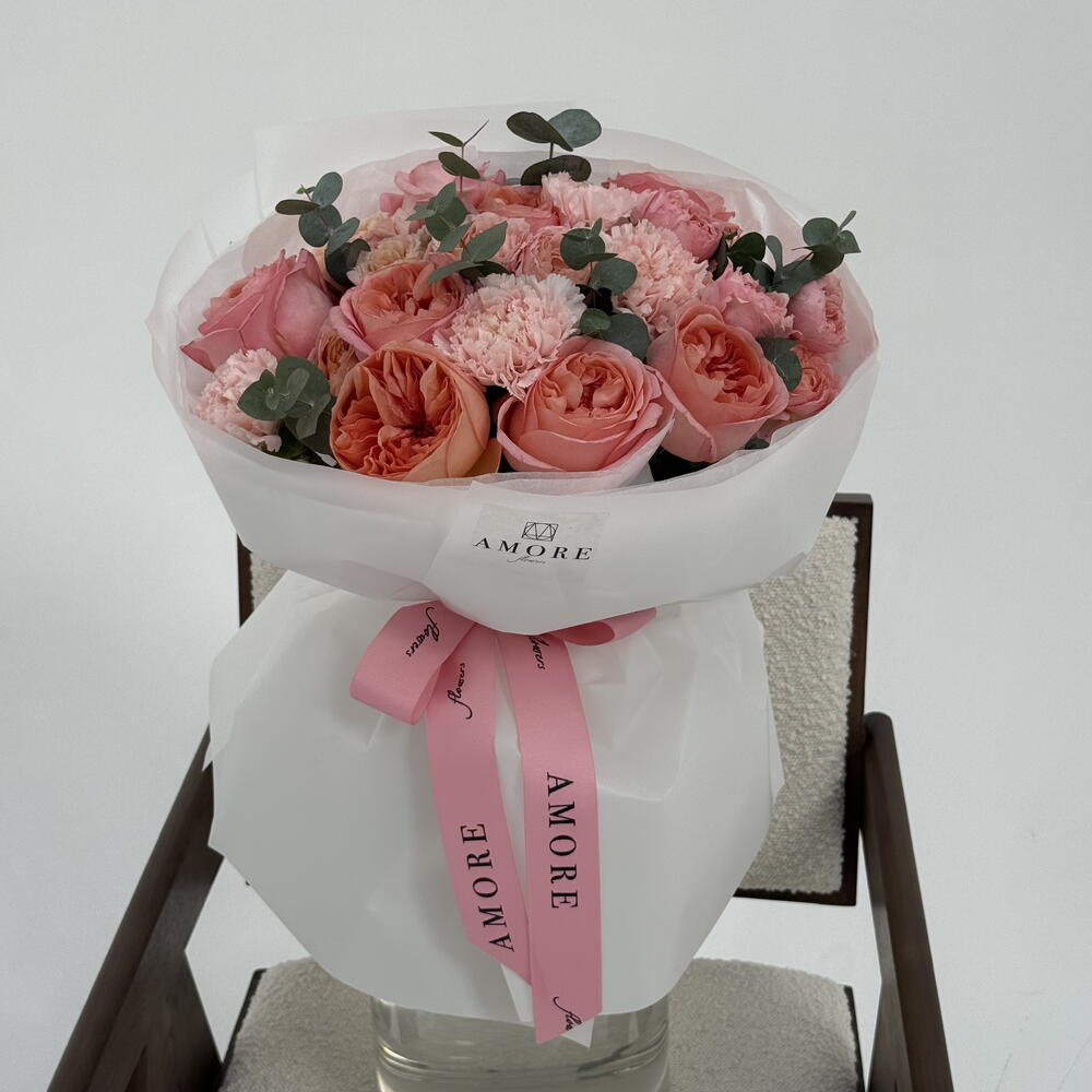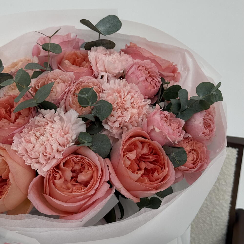 Eucalyptus - 5 pcs pink expresion - 8 pcs julietta spray rose - 3 pcs carnation hanoi - 5 pcs