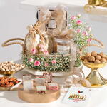 Celebrate the spirit of unity and joy with this exquisite floral arrangement that pays tribute to the National Day of UAE. Adorned with fragrant pink spray roses and delicate white baby\s breath, it symbolizes grace and camaraderie. Nestled in a golden metal tray, this arrangement harmonizes elegance with tradition. Complete with peri-peri almonds, pistachios, caramel chocolate truffles, and sandwich barfi, its a sensory celebration, a perfect gift for honouring this significant day. An accompanying greeting card with a National Day wish makes this arrangement even more special.