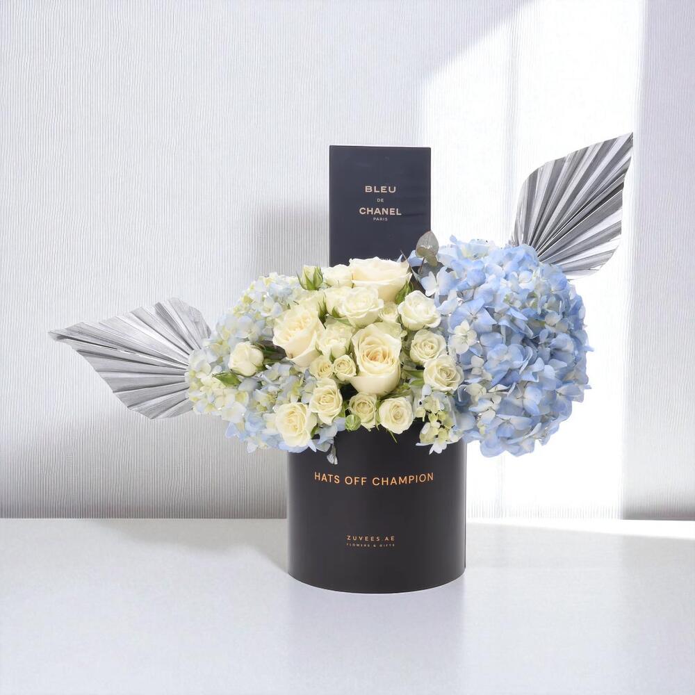 Hats Off Champion Graduation Flower Box with BLEU DE CHANEL – Luxe Floral Gift for Men