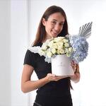 blue hydrangeas - 2 pcs white roses - 7 pcs white spray roses - 6 pcs