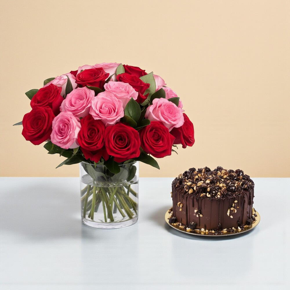 Des - 31 Red n Pink Roses Vase with Chocolate and hazelnut flavor cake, size 4 portion, serving 4 to 5 people