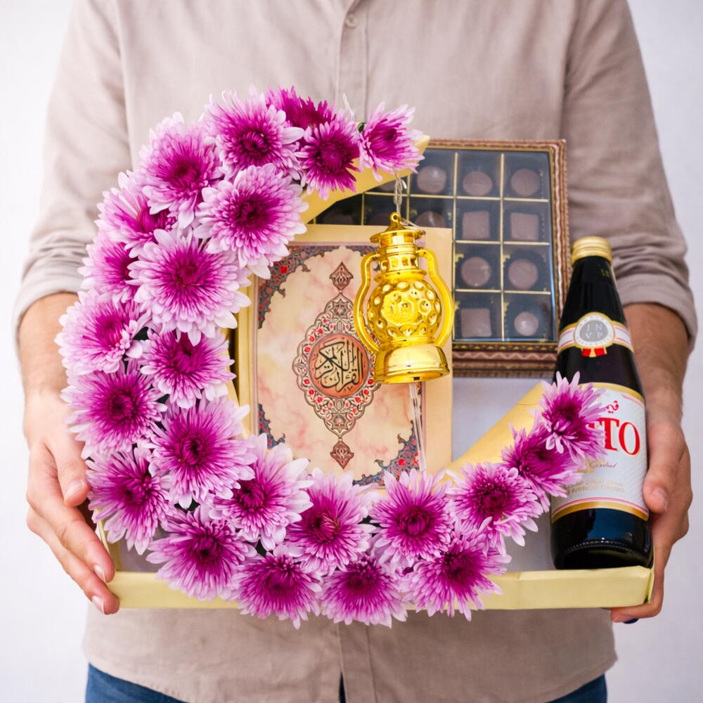 هذه سلة هدايا فريدة ومميزة تضم مجموعة متنوعة من المنتجات عالية الجودة والمحببة. تحتوي السلة على 25 قطعة من الشوكولاتة البلجيكية الغنية والذكية التي تضيف لحظات حلوة ليومك. بالإضافة إلى 15 قطعة من الزهور التي تضفي لمسة من الجمال والرقي. كما أنها تحتوي على قطعة واحدة من فيمتو اللذيذ وجميل. بل تضم أيضاً المصحف الشريف لتضيف بركة روحانية للسلة. تجد فيها أيضاً فانوس رمضان وهلال رمضان، مما يجعلها الهدية المثالية لهذا الشهر الكريم.