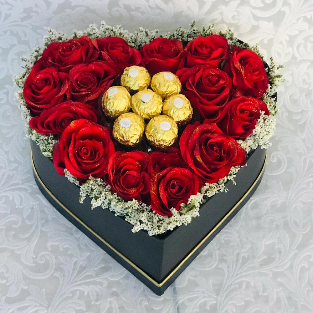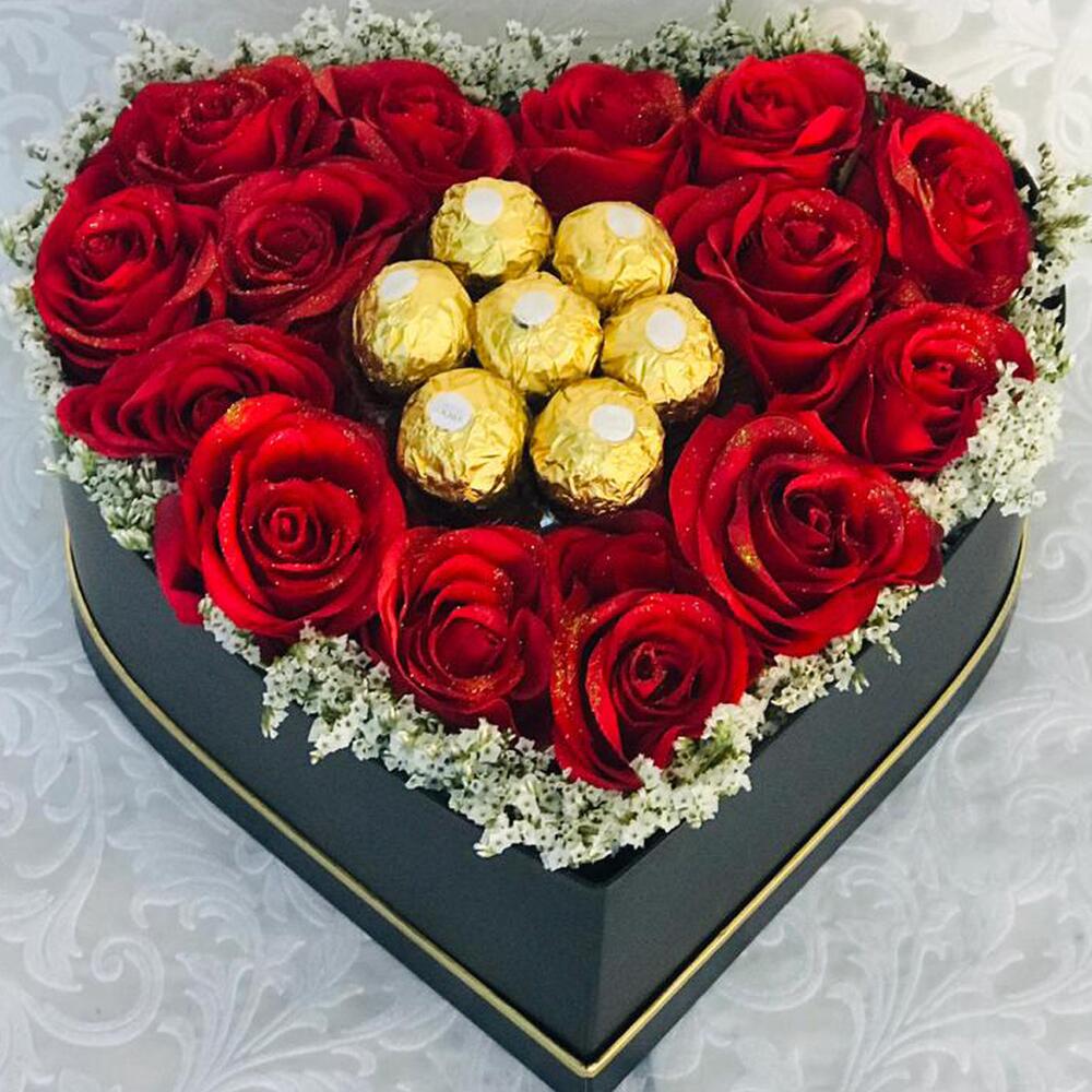 heart box - 1 pcs gypso - 5 pcs fererro rocher - 7 pcs red roses - 15 pcs
