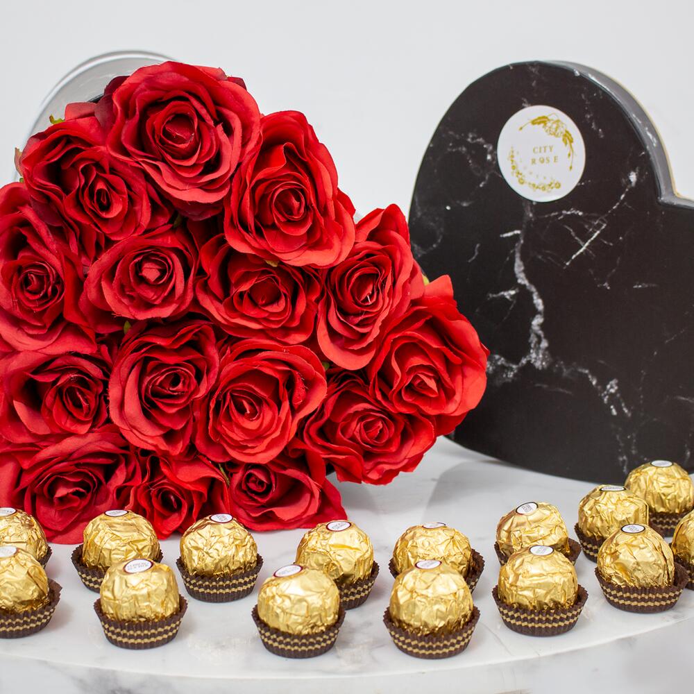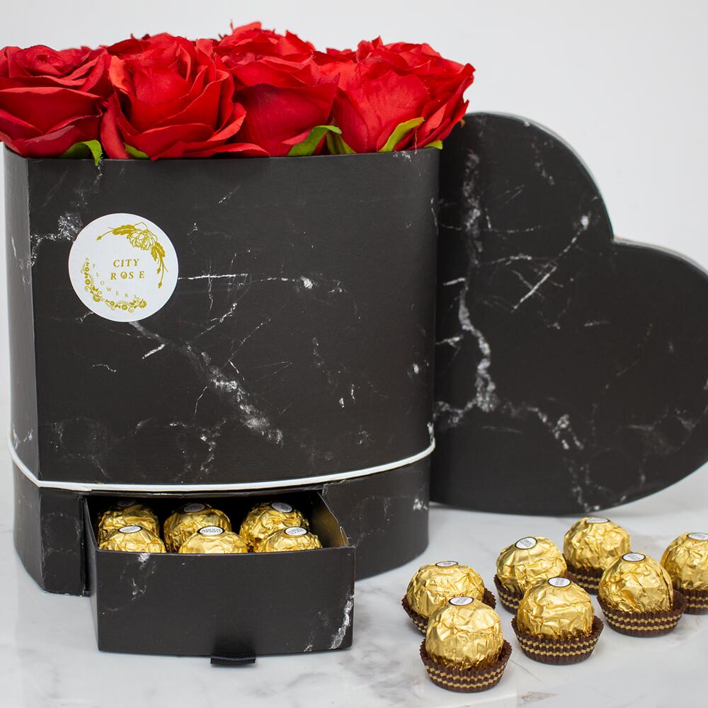 Red rose - 31 pcs Chocolate - 12 pcs black box - 1 pcs